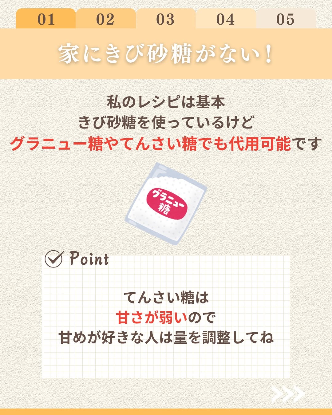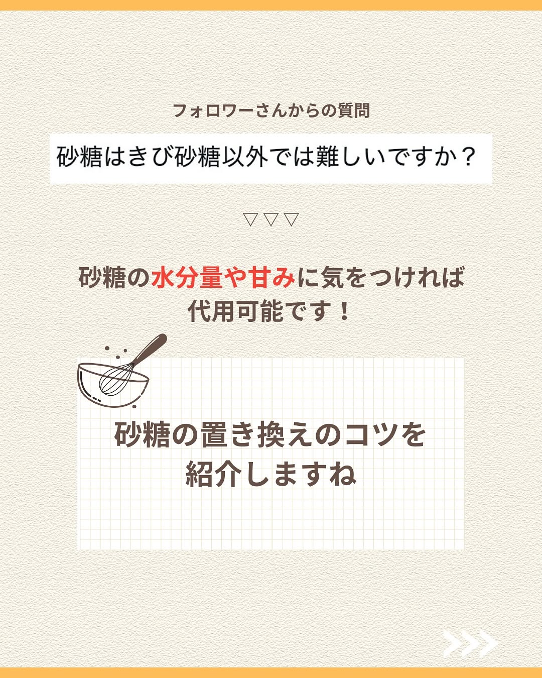 👇砂糖を代用するには? 元パティシエけい @kei_sweets_recipe 「砂糖を代用出来ますか?」 そんな疑問にお答えします✨ 砂糖によって "水分量"や"甘み"が違うため 注意が必要⚠️ 代用したい時には 投稿の内容を参考にしてみてね🥰 ①🍰12月オンライン米粉おかし教室開講準備中🍰 ②公式LINE登録では ✅レッスンの先行案内 ✅LINE登録者限定のレシピ🎁 などを発信しております🍰 〈プレゼント受け取り方法〉 ▽ ▽ ▽ @kei_sweets_recipe プロフィールのURLから 公式LINEへ飛べます! わからないことがあったら コメントやDMで聞いてくださいね🥰 - - - - - - - - - - - - - - - - - - - #グルテンフリーおやつ #体に優しいおやつレシピ #秋スイーツ #米粉のお菓子教室 #親子ごはんの悩みサポート
