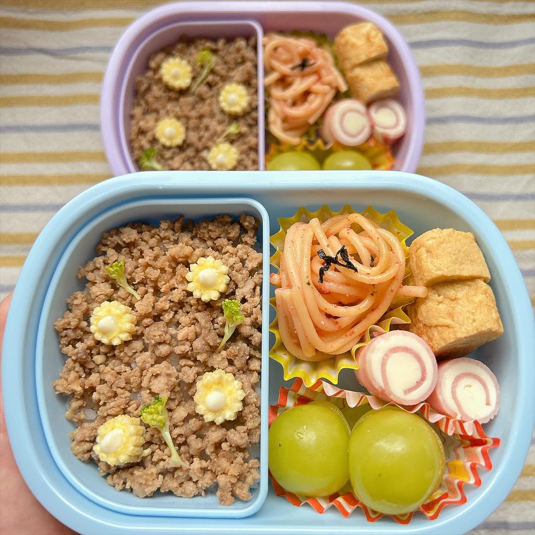 2025.10.28 ヤングコーンのお花弁当 しぶとい風邪を3人で移し合いながーーーーーい看病週間でした。 大人には移らなくてひとまずヨカッタ😮💨 なんだけど、昨夜末っ子ちゃんが生まれてから 一番というくらいに夜泣きして…寝不足です。。🥱🫧 まだ鼻が詰まるみたいで苦しそう💦 久々のお弁当はそぼろごはんです😊(少なめ) そぼろごはん たらこパスタ たまご焼き くるくるハムチーズ シャインマスカット ・ ・ #お弁当#お弁当記録#おべんたぐらむ#親子ごはんの悩みサポート #幼稚園弁当#年中弁当#こども弁当#双子弁当