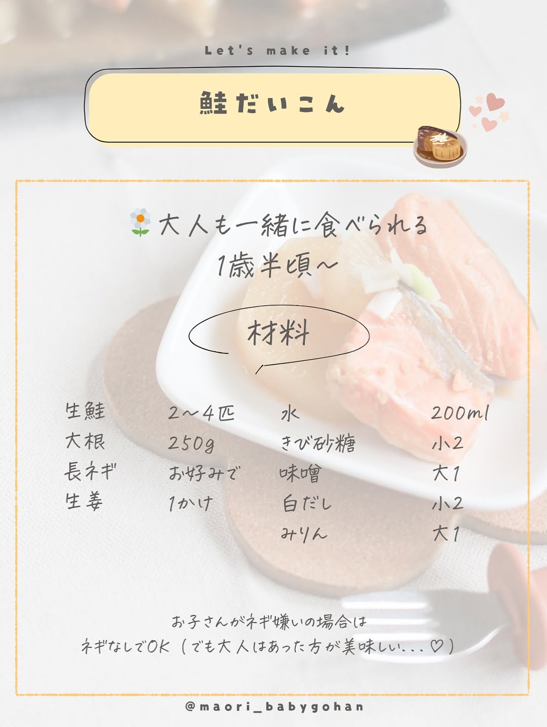 お子さん、魚好き😳? おばんです〜あやかだよ( •︠ࠏ•︡ ) 秋にぴったり! ほっこりあたたまる鮭大根はどう🥺? じっくり煮ることで、 大根もやわらかくて食べやすくなるよ♡ 鮭はもう絶品🥹🩷 ほろっとほわっと(笑)とっても美味しく味がしみる🥰 魚好きも魚嫌いも食べてほしい鮭大根です☺️ 鮭は大きめに切るのがおすすめ! なんなら切らなくてもOK! 作ってみてね🤝🏻✨ 今回の投稿も保存しとくのがおすすめ🙌🏻 おすすめから来たみなさん♡ ぜひフォローしていってね🥹 離乳食・幼児食のレシピで悩まなくなるよ😊 ↓↓ @maori_babygohan すでにフォローしてくれてるまおりんずのみんな♡ いいね・コメントめちゃくちゃ嬉しいよ〜😭❤️🔥 今日もよろしくお願いします🙇🏻♂️圧圧圧ww いつもありがとう🫶🏻🌈 𓈒𓏸𓈒꙳𓂃 𓈒𓏸𓈒꙳𓂃 𓈒𓏸𓈒꙳𓂃 𓈒𓏸𓈒꙳𓂃 𓈒𓏸𓈒꙳𓂃 #離乳食 #幼児食 #鮭大根 #鮭 #魚 #親子ごはんの悩みサポート