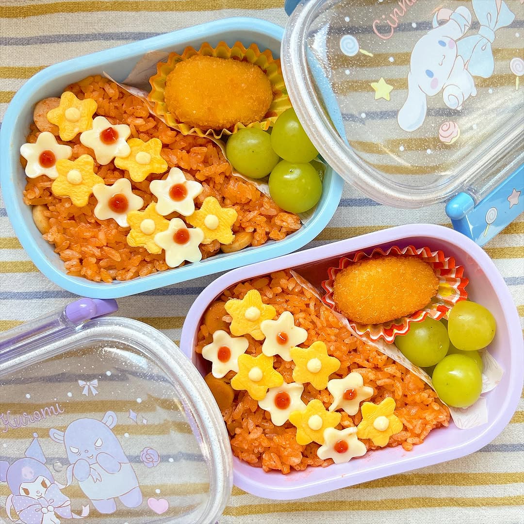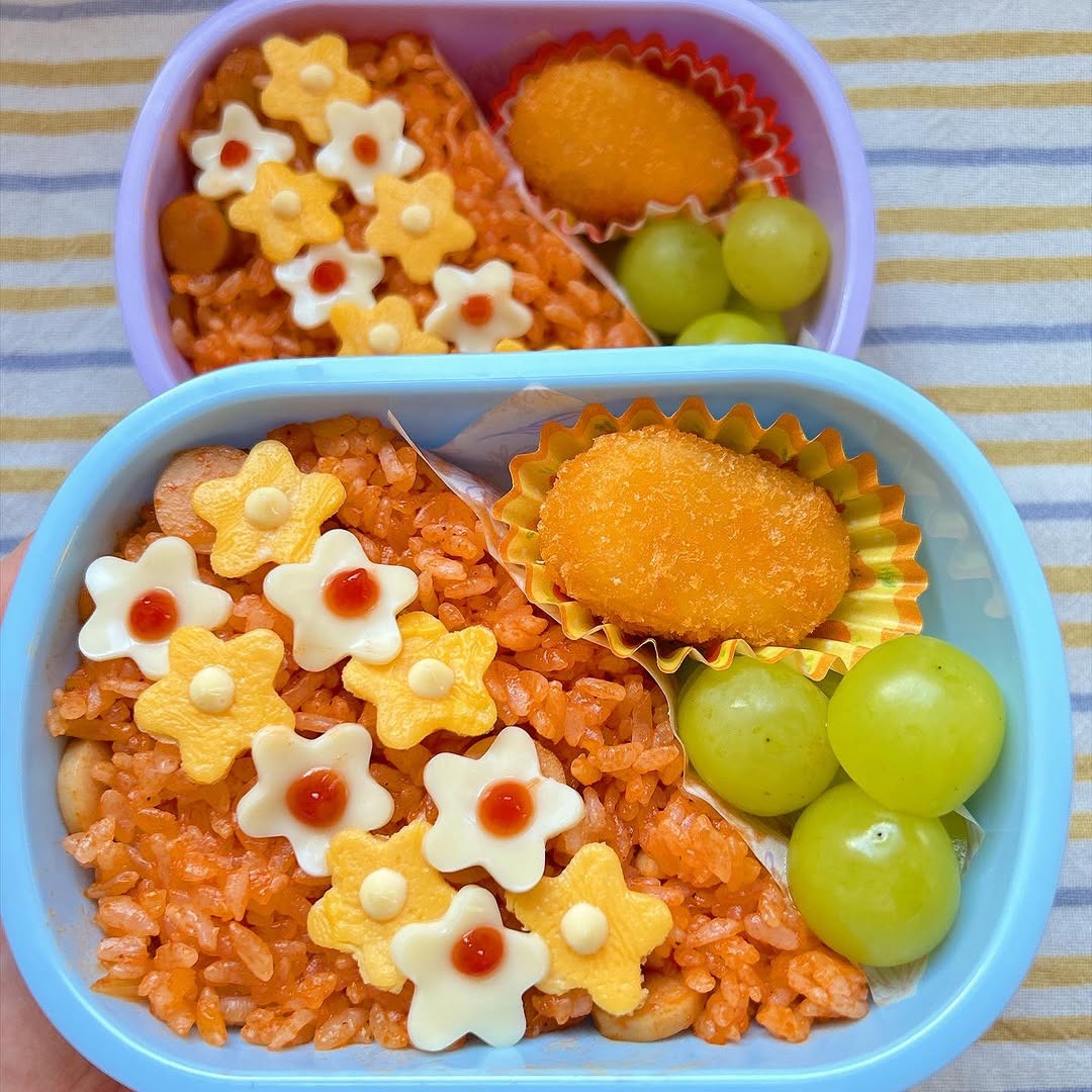 2025.9.22 #オムライス弁当 薄焼きたまごは濾すと綺麗になると何かで見たのでやってみました😊 お花だよって言ったら、星じゃないのー?って。笑 ごはんが多めなのでおかず少なめです。 お花のオムライス コーンコロッケ シャインマスカット ・ ・ #お弁当#お弁当記録#親子ごはんの悩みサポート#おべんたぐらむ #幼稚園弁当#年中弁当#こども弁当#双子弁当
