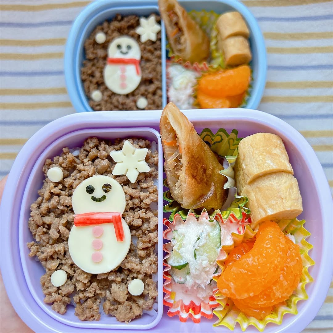 2025.11.28 #スノーマン弁当 第二弾のスノーマン⛄️ なんだかぽかぽかあったかいのですが🫧 双子はプリキュアにハマり、グッズを探す毎日👀 私も家事をしながらアニメを観て、歌を覚え中〜 絵が細かすぎてキャラ弁は無理そう…おにぎりラップを探し中です♩ 今週もお疲れ様でした☺️ 12月もよろしくお願いします🎄! そぼろごはん 春巻き たまご焼き カニときゅうりのマヨ和え 🍊 ・ ・ #お弁当#お弁当記録#おべんたぐらむ#毎日お弁当日記 #幼稚園弁当#年中弁当#こども弁当#親子ごはんの悩みサポート
