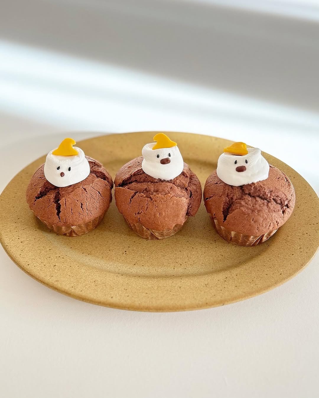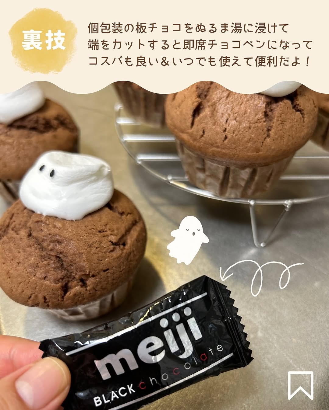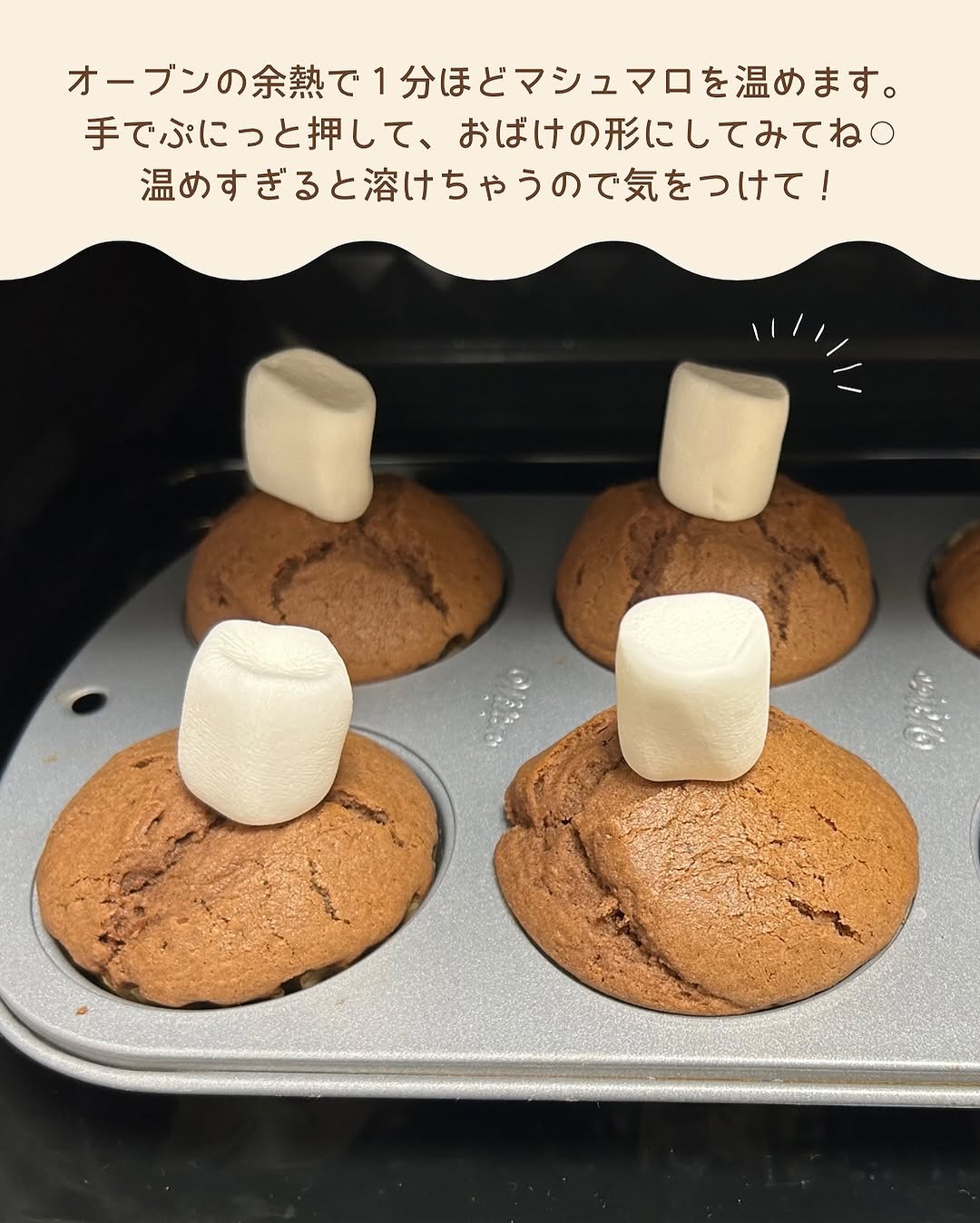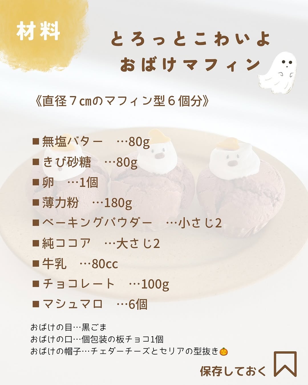〖 とろ〜り🎃🍫おばけチョコマフィン 〗@oto___rii ⇦その他の簡単かわいいイベントごはんはこちら🌿 本日のレシピはとろ〜りマシュマロと チョコのおばけマフィンの紹介です☕️ おばけの顔を作っているときニヤニヤが止まりませんでした... かわいくてとっても美味しいのでぜひ作ってみてね🎃🥣 ﹏﹏﹏﹏﹏﹏﹏﹏﹏﹏﹏﹏﹏﹏﹏﹏ 【材料】直径7㎝のマフィン型6個分 無塩バター 80g きび砂糖 80g 卵 1個 薄力粉 180g ベーキングパウダー 小さじ2 純ココア 大さじ2 牛乳 80cc チョコレート100g マシュマロ 6個 おばけの目⇨黒ごま おばけの口⇨個包装のチョコ1個 おばけの帽子⇨チェダーチーズを100円ショップのハロウィン型セットに入っていた帽子で型抜きをしました🎃 ﹏﹏﹏﹏﹏﹏﹏﹏﹏﹏﹏﹏﹏﹏﹏﹏ 【作り方】 ①《下準備》オーブンは180℃に予熱する。バター、卵は常温に戻しておきます ②ボウルにバターを入れてやわらかくなるまで泡立て器で混ぜ、砂糖を加え、白っぽくふんわりするまで混ぜる。溶き卵を少しずつ加えてその都度よく混ぜる ③薄力粉、ベーキングパウダー、純ココアを合わせてふるって加え、ゴムベラで切るように混ぜる。チョコレートを小さく割り入れ、切るように混ぜる。牛乳を加えてさらによく混ぜる ④型にマフィン生地を等分に流し入れ、平らにならす。180℃に予熱したオーブンで20〜25分焼く ※竹串をさして生地がついてくる場合は追加で加熱🍫 ⑤マフィンが焼き上がったらマシュマロを乗せ、1分間オーブンの余熱で溶かします。上から手でぷにっと押すとおばけの形になります。 ⑥マフィンの粗熱が取れたらマシュマロに黒胡麻で目をつけて、個包装のチョコを袋のまま湯煎で溶かし、端をカットしておばけの口を付けたら完成! お好みで帽子を乗せたり飾り付けをしてもかわいいです☺️ ハロウィンレシピもたくさん投稿していくので フォローして待っててね🎃 作り方でわからないことなどあれば お気軽にコメントやDMくださいね📝 ﹏﹏﹏﹏﹏﹏﹏﹏﹏﹏﹏﹏﹏﹏﹏﹏ とり|簡単かわいいイベントごはん @oto___rii ☜忙しいママ&料理が苦手でも ちょっとだけ特別な日に作りたいレシピをお届け🌷 つくれぽもお待ちしております♡ タグ付けでダッシュで伺います🐣 ﹏﹏﹏﹏﹏﹏﹏﹏﹏﹏﹏﹏﹏﹏﹏﹏ #マフィン #マフィンレシピ #ハロウィンマフィン #おばけマフィン#ハロウィンレシピ #ハロウィン #ハロウィンごはん #お菓子作り #お菓子レシピ #おうちスイーツ #こどもと料理 #こどもとつくる #こどものおやつ #簡単レシピ #こどもごはん #幼児食レシピ #フーディーテーブル #フーディストノート #Halloween #halloweenfood #halloweendecor