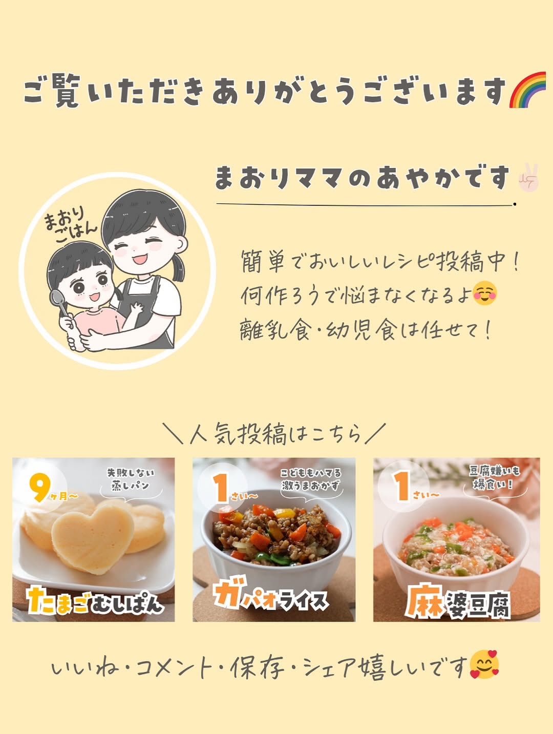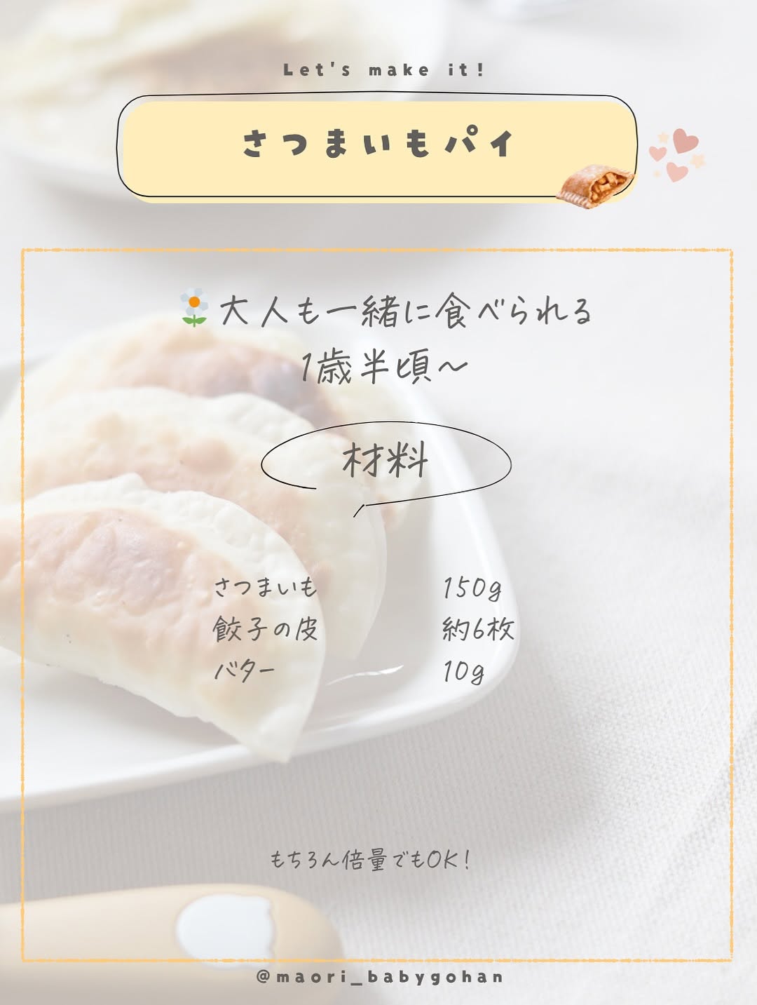 みんなーーー!お待たせしました🥰 おばんです〜あやかだよ( •︠ࠏ•︡ ) ストーリーに載せたら反響が大きかったこれ🍠❤︎ このタイミングで載せる予定ではなかったけど あまりにもDMをもらったので爆速編集したぞーー🥹🩷 実は、餃子のレシピを作ってて あー、餃子の皮あまるなって思ってできたレシピなの😂✨ なので近々餃子レシピが投稿されます🫣💛 素朴で美味しい♡おやつにも、 ちょっとしたおかずにもぴったりなさつまいもパイだよ🥧🥰 皮をくっつけるときは 皮の上の方にさつまいもを乗せて 水は指で2回くらいつけ フォークで押してくっつけてね☺️ さつまいもは多く入れすぎると 皮からはみ出すので、ほどほどにね🥹 今回の投稿も保存しとくのがおすすめ🙌🏻 おすすめから来たみなさん♡ ぜひフォローしていってね🥹 離乳食・幼児食のレシピで悩まなくなるよ😊 ↓↓ @maori_babygohan すでにフォローしてくれてるまおりんずのみんな♡ いいね・コメントめちゃくちゃ嬉しいよ〜😭❤️🔥 今日もよろしくお願いします🙇🏻♂️圧圧圧ww いつもありがとう🫶🏻🌈 𓈒𓏸𓈒꙳𓂃 𓈒𓏸𓈒꙳𓂃 𓈒𓏸𓈒꙳𓂃 𓈒𓏸𓈒꙳𓂃 𓈒𓏸𓈒꙳𓂃 #離乳食 #幼児食 #さつまいもパイ #さつまいも #餃子 #混ぜごはん #親子ごはんの悩みサポート