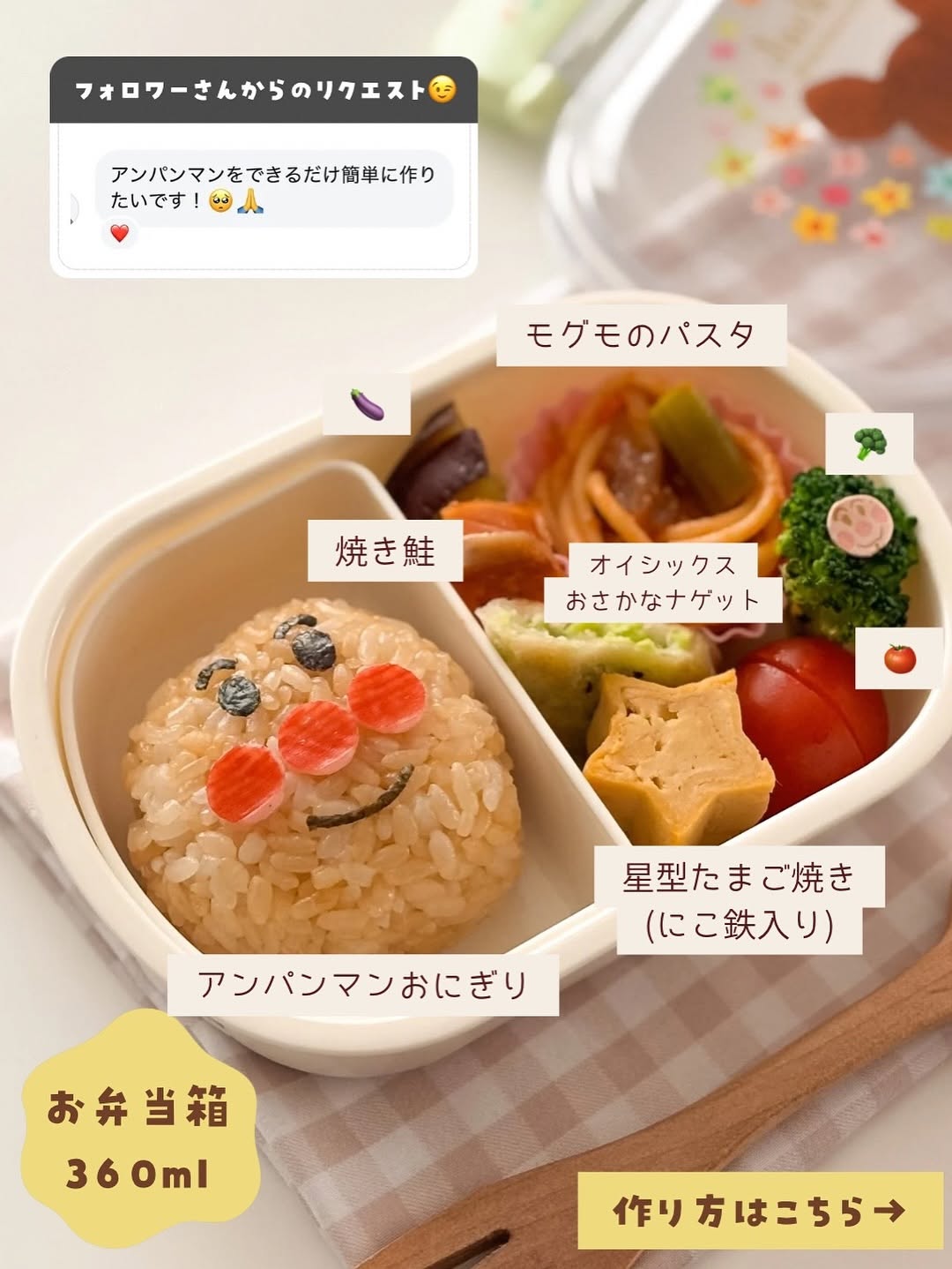 こんばんはー!🥹✨ わぁ!作れそう!!って思ったら 🩷ってコメントしてね☺️ 今日はフォロワーさんからのリクエスト!! 1番簡単なアンパンマンを作ったよ😆 パーツは型抜きとのりパンチに頼るから 不器用でもかわいく作れちゃう✌🏻 いつものお弁当にたった5分時間をかけるだけで 子供が大喜びするお弁当に大変身✨ ぜひぜひ作ってみてね〜😆 #親子ご飯の悩みサポート