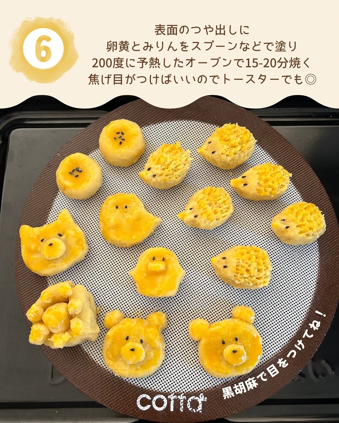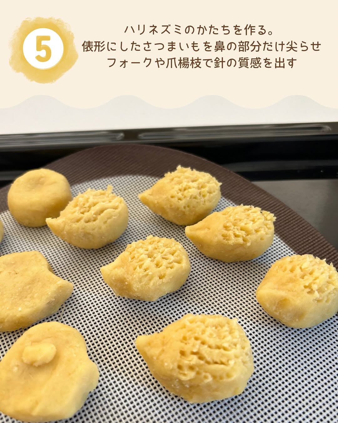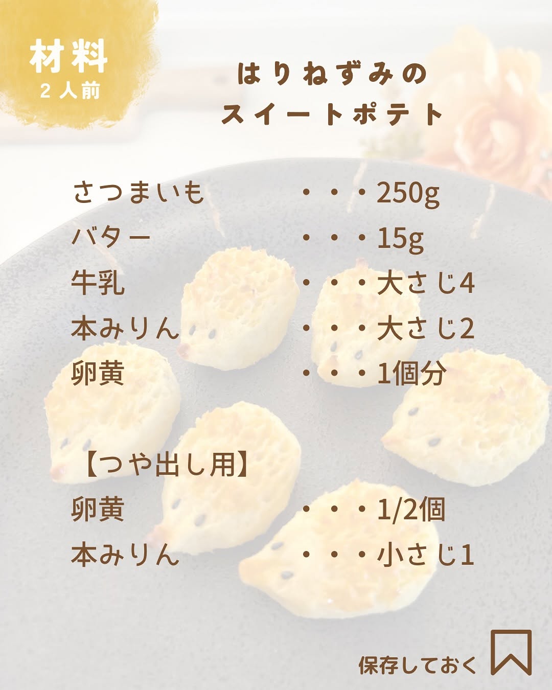 〖🦔🍠はりねずみのスイートポテト 〗@oto___rii ⇦その他の簡単かわいいイベントごはんはこちら𓅯 こんばんは! お芋がおいしい季節ですね☺️ 新しいカフェラテといっしょに食べたい ころんとかわいいハリネズミの スイートポテトを作りました。 砂糖不使用なのですが、隠し味に 本みりんを使うことによって 自然な甘さとコクが出るのでおすすめです! ﹏﹏﹏﹏﹏﹏﹏﹏﹏﹏﹏﹏﹏﹏﹏﹏ 【材料】2人分 さつまいも ・・・250g バター ・・・15g 牛乳 ・・・大さじ4 本みりん ・・・大さじ2 卵黄 ・・・1個分 ↓つや出し用 卵黄 ・・・1/2個 本みりん ・・・小さじ1 【作り方】 ❶ さつまいもは皮を剥き 5分ほど水にさらしておきます ❷ 耐熱容器にさつまいもを入れ 600wの電子レンジで8分加熱したあと バター、牛乳、卵黄を加える ❸ フォークやマッシャーで なめらかになるまで潰したら 本みりんを入れ、更によく混ぜる ❹成形しやすいように線を入れ冷蔵庫で15分冷やす ❺俵形にし、鼻の部分を尖らせ フォークなどで針の質感を出す ❻つや出しに、本みりんと卵黄をスプーンなどで塗ったら、黒胡麻で目をつけ200度に予熱したオーブンで15-20分焼く ⇨焼き目がつけばいいのでトースターでも◎ ﹏﹏﹏﹏﹏﹏﹏﹏﹏﹏﹏﹏﹏﹏﹏﹏ ハロウィンレシピもたくさん投稿していくので フォローして待っててね🎃 作り方でわからないことなどあれば お気軽にコメントやDMくださいね📝 ﹏﹏﹏﹏﹏﹏﹏﹏﹏﹏﹏﹏﹏﹏﹏﹏ とり|簡単かわいいイベントごはん @oto___rii ☜忙しいママ&料理が苦手でも ちょっとだけ特別な日に作りたいレシピをお届け🌷 フォローしていただけるとうれしいです♡ つくれぽもお待ちしております タグ付けでダッシュで伺います🐣 ﹏﹏﹏﹏﹏﹏﹏﹏﹏﹏﹏﹏﹏﹏﹏﹏ #秋レシピ #スイートポテト #さつまいも #はりねずみ #🦔