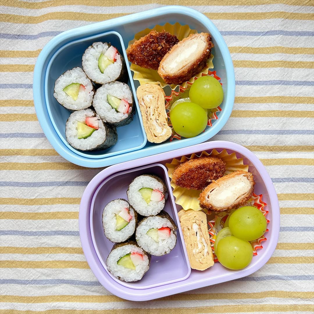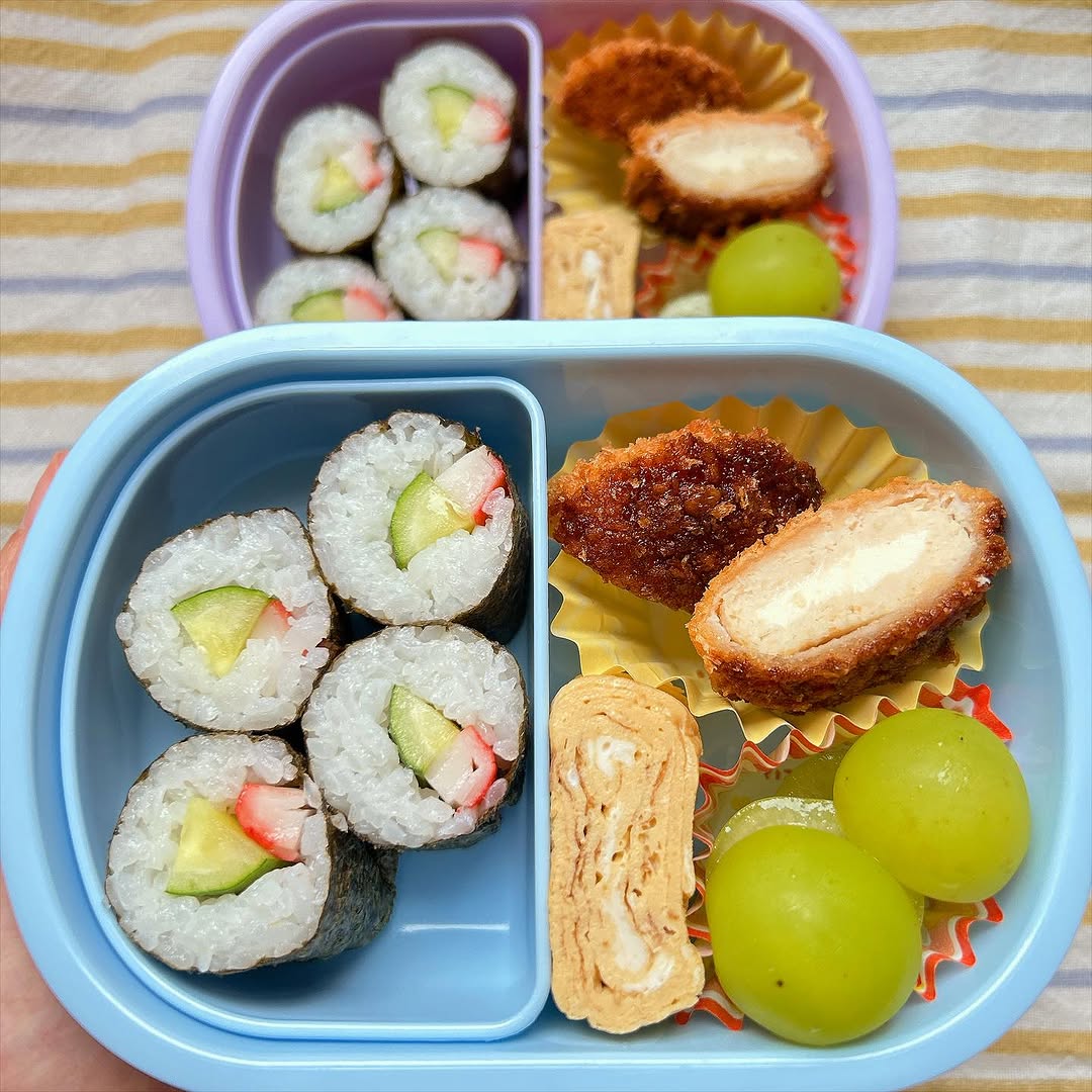 2025.10.16 #海苔巻き弁当 朝に海苔巻きだけ作って あとはチンして切って、入れるだけでした☺️ 海苔巻き(きゅうりとカニカマ) チーズカツ たまご焼き シャインマスカット ・ ・ #お弁当#お弁当記録#おべんたぐらむ#親子ごはんの悩みサポート #幼稚園弁当#年中弁当#こども弁当#双子弁当