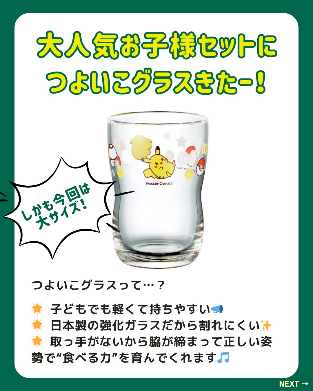 こんにちは🌞 くふう.キッズごはんスタッフです😘💛 11月といえば…毎年話題の【#ミスド×#ポケモンコラボ 】が登場✨ 今年もあの「つよいこグラス」付きセットが買える季節になりました🎁 実はこの“つよいこグラス”、ただのグッズじゃないんです👀 ママたちの間で人気の理由は… 👶軽くて持ちやすい&割れにくい 🧠飲む・噛む・姿勢など「食べる力」を育む設計 🍴日本製で安心の強化ガラス✨ しかも今回は【ドーナツ2個+大サイズのグラス付きで1,100円(税込)】と超お得!🍩💛 ピカチュウのドーナツもかわいすぎて、子どもが大喜び間違いなし🥰 数量限定なので、欲しい人は早めのネットオーダーがおすすめです⚡ ここだけの話ですが… 「商品準備中」表示で在庫がない場合は、ネットオーダーで11月下旬の受取日を見てみると、まだ残っている可能性があるよ😉✨ 週末は家族で「ミスドいこ〜!」🍩🌈😋💛 ※画像引用:株式会社ダスキン公式プレスリリースより ======================= 「くふう.キッズごはん」は、 子育て中のママパパが“もっと気楽に もっと楽しく” こどもごはんと向き合えるように、 ▶️ レシピ ▶️ 外食・テイクアウト情報 ▶️ レトルト・冷食活用 ▶️ 食育&便利グッズ などを発信しています🎶 フォローして、毎日のごはん時間をちょっとラクに🍴💛 👉️ @kufu_kidsgohan #ミスド #ミスドポケモン #ミスタードーナツ #つよいこグラス #ポケモングッズ #ピカチュウドーナツ #おやつ時間 #親子ごはん #幼児食 #ごほうびおやつ #ごはんづくり疲れた #ごはん作りたくない日 #ママライフ #共働きごはん #くふうキッズごはん #親子ごはんの悩みサポート #保存推奨 #お得情報
