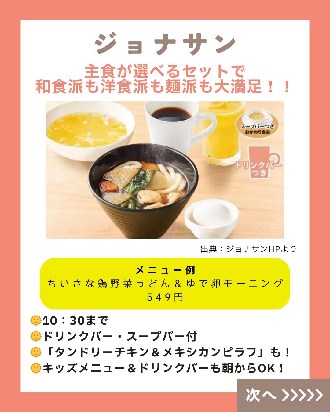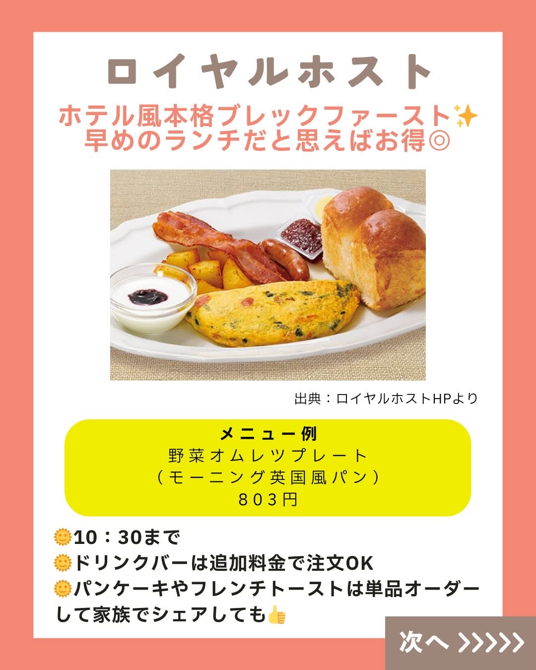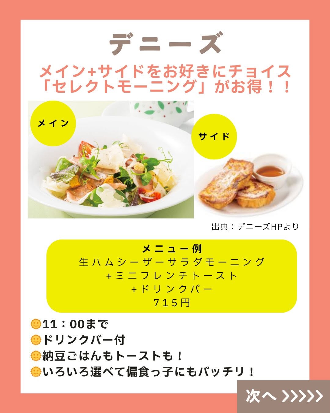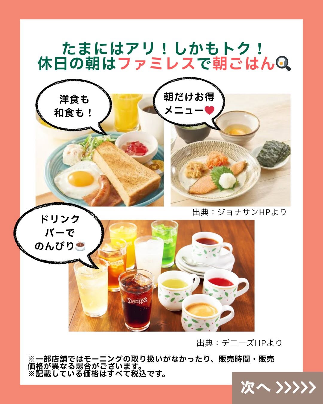 こんにちは! 「くふう キッズごはん」スタッフです😊💕 師走が迫ってきて毎日忙し―――💦💦 ですよね?? 週末は息抜きできていますか?? そこで! 週末の朝ごはんは思い切って外食へ! といっても、子連れだと 朝マック一択…と思っていませんか?? じ・つ・は!! ファミレスのモーニングメニューって めっちゃ充実していて、 週末のごほうびにピッタリ✨ トースト&卵料理といった定番はもちろん、 焼き魚とごはん・お味噌汁の和定食、 ファミレスならではの ハンバーグやカレーメニューまで!! サイドメニューでポテトやスープも 選べるところもあって 少食キッズにもぴったり🥰 そしてうれしいのが、 ほとんどのファミレスが「ドリンクバー」も朝から実施☕️ 好きなドリンクを飲み放題だから、 お得感ハンパないっ! さらにさらに…! 朝だけのモーニングバイキング実施店も👀 いろんなお得や楽しみが待っている ファミレスモーニング、 がんばる毎日のごほうびとして家族でGO・GO!! 週末の朝ごはん、気楽に楽しんでいこ~📣 ======================= くふう キッズごはんは、 子育て中のママパパが“もっと気楽に もっと楽しく” こどもごはんと向き合えるように、 ▶️レシピ ▶️外食情報 ▶️レトルト・冷食活用 ▶️便利グッズ などの情報を発信しています✨ 好き嫌い&食べムラ向けレシピもたくさん🍅🥦 こどもごはんづくりのヒントにしてくださいね💖 \詳しくはプロフィールリンクからチェック/ 👉 @kufu_kidsgohan #親子ごはんの悩みサポート #ファミレスモーニング #くふうキッズごはん