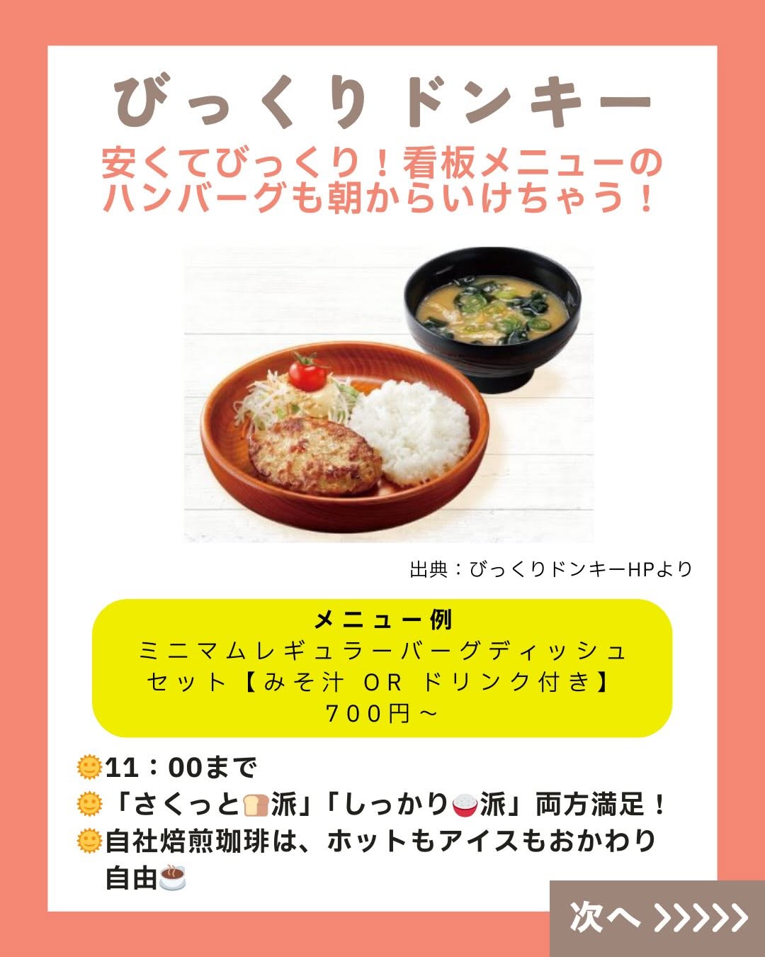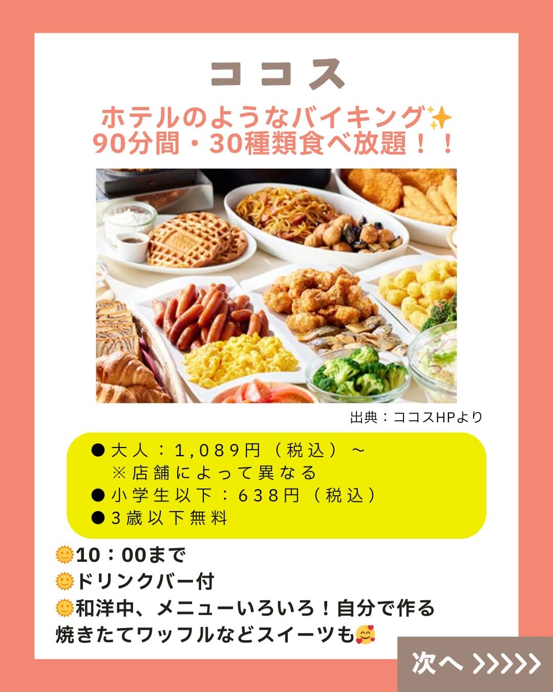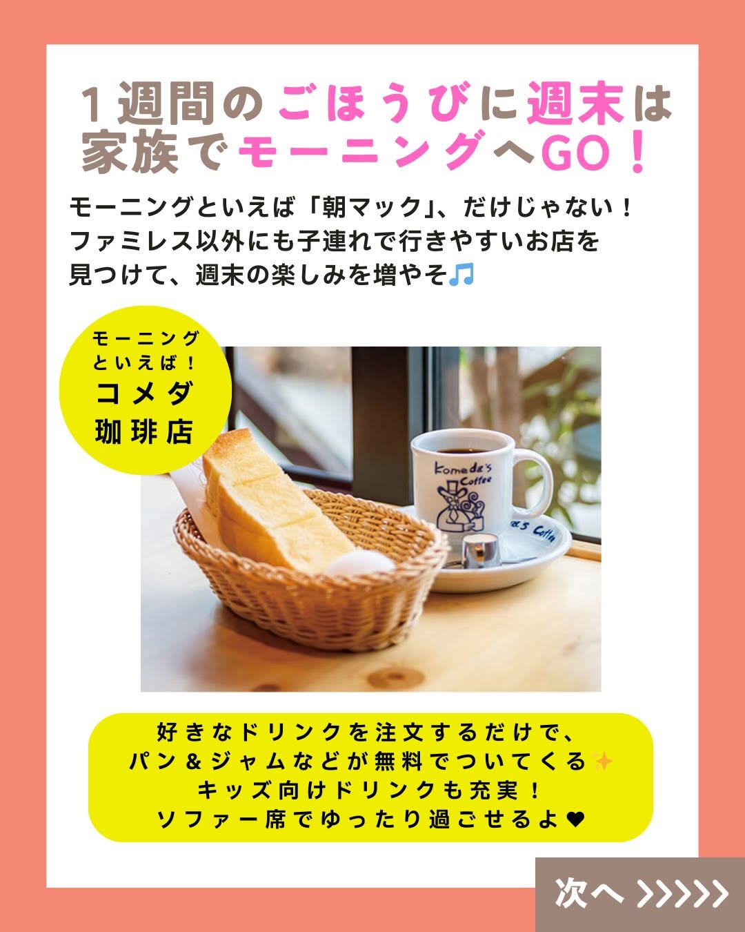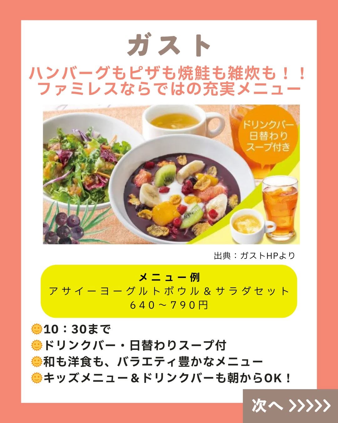 こんにちは! 「くふう キッズごはん」スタッフです😊💕 師走が迫ってきて毎日忙し―――💦💦 ですよね?? 週末は息抜きできていますか?? そこで! 週末の朝ごはんは思い切って外食へ! といっても、子連れだと 朝マック一択…と思っていませんか?? じ・つ・は!! ファミレスのモーニングメニューって めっちゃ充実していて、 週末のごほうびにピッタリ✨ トースト&卵料理といった定番はもちろん、 焼き魚とごはん・お味噌汁の和定食、 ファミレスならではの ハンバーグやカレーメニューまで!! サイドメニューでポテトやスープも 選べるところもあって 少食キッズにもぴったり🥰 そしてうれしいのが、 ほとんどのファミレスが「ドリンクバー」も朝から実施☕️ 好きなドリンクを飲み放題だから、 お得感ハンパないっ! さらにさらに…! 朝だけのモーニングバイキング実施店も👀 いろんなお得や楽しみが待っている ファミレスモーニング、 がんばる毎日のごほうびとして家族でGO・GO!! 週末の朝ごはん、気楽に楽しんでいこ~📣 ======================= くふう キッズごはんは、 子育て中のママパパが“もっと気楽に もっと楽しく” こどもごはんと向き合えるように、 ▶️レシピ ▶️外食情報 ▶️レトルト・冷食活用 ▶️便利グッズ などの情報を発信しています✨ 好き嫌い&食べムラ向けレシピもたくさん🍅🥦 こどもごはんづくりのヒントにしてくださいね💖 \詳しくはプロフィールリンクからチェック/ 👉 @kufu_kidsgohan #親子ごはんの悩みサポート #ファミレスモーニング #くふうキッズごはん