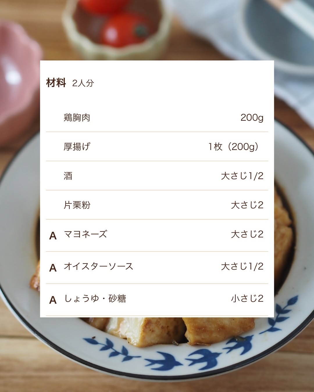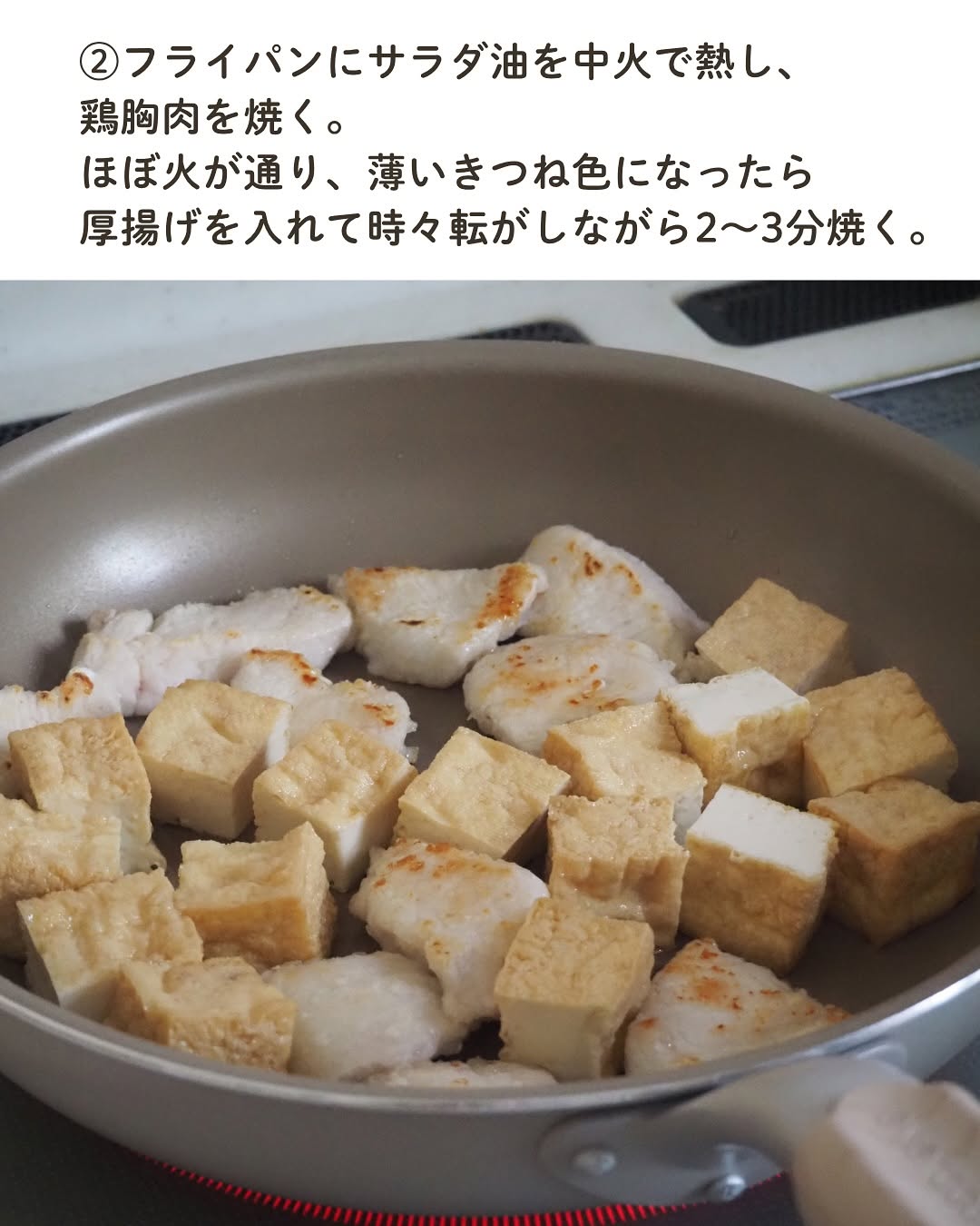胸肉と厚揚げのオイマヨ炒め🍳 節約にぴったりなボリューム満点レシピです💯 節約中の人にも食べ盛りのお子さんがいる家庭にもぴったり! オイマヨのコクがたまりません🤤 長女が厚揚げ好きと判明したので これからどんどん出していこうと思います😂✨ 【材料】(2〜3人分) 鶏胸肉...200g 厚揚げ...1枚 酒...大さじ1/2 片栗粉...大さじ2 マヨネーズ...大さじ2 オイスターソース...大さじ1/2 しょうゆ・砂糖...小さじ1 【作り方】 ①鶏胸肉...一口大の削ぎ切りにし、酒を揉み込み片栗粉をまぶす。 厚揚げ...油抜きし、一口大(2〜3cm角)に切る。 ②フライパンにサラダ油を中火で熱し、鶏胸肉を焼く。 ほぼ火が通り、薄いきつね色になったら厚揚げを入れて時々転がしながら2〜3分焼く。 ③弱火にし、混ぜ合わせたAを加えて絡める。 ⋆⋆⋆⋆⋆⋆⋆⋆⋆⋆⋆⋆⋆⋆⋆⋆⋆⋆⋆⋆⋆⋆⋆⋆⋆⋆⋆⋆⋆⋆⋆⋆⋆⋆⋆⋆⋆⋆ このアカウントでは 料理や買ってよかったものなどを 投稿しています ︎ @usagi.no.recipe ⋆⋆⋆⋆⋆⋆⋆⋆⋆⋆⋆⋆⋆⋆⋆⋆⋆⋆⋆⋆⋆⋆⋆⋆⋆⋆⋆⋆⋆⋆⋆⋆⋆⋆⋆⋆⋆⋆ #時短レシピ #親子ごはんの悩みサポート