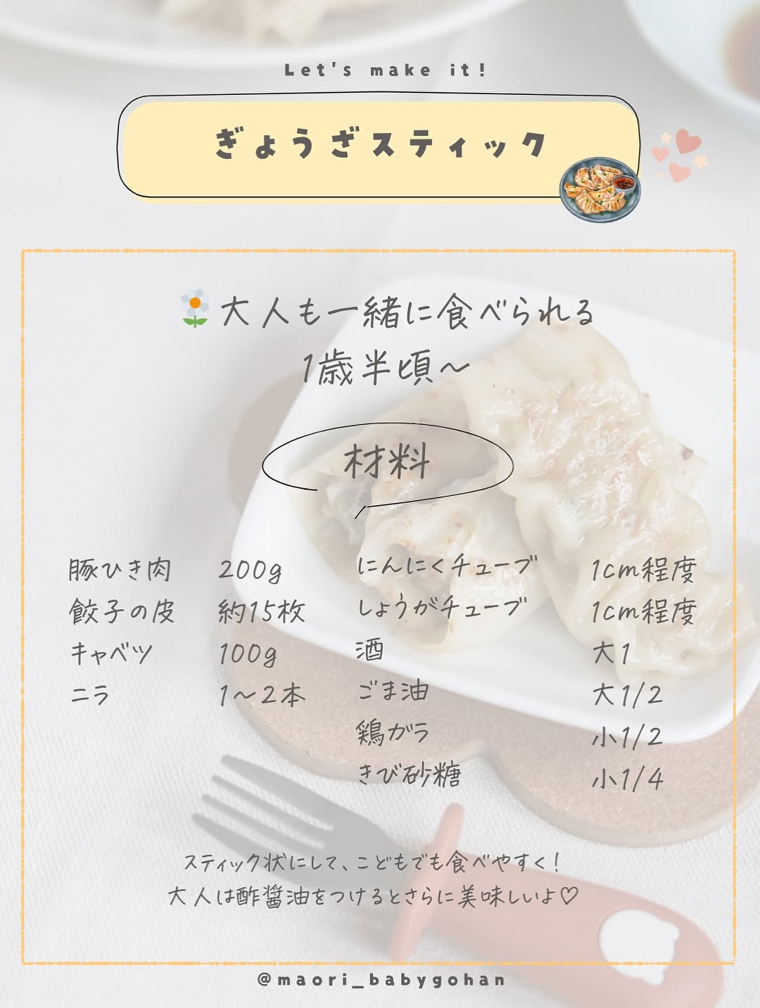 今回はフォロワーさんのリクエストです☺️💛 おばんです〜あやかだよ( •︠ࠏ•︡ ) あ、ちなみに... 餃子を🥟←の形にしたい人は もちろん包んでOKだからね🫢? 【こどもが食べられる餃子】を リクエストしていただきました🥰✨ 薄味で作ってるから 大人が一緒に食べるときは酢醤油をつけて 食べてみてね〜😍! 入り切らなかったのでレシピの補足! 巻くときは、くるっとしたあとに ラップの上からちょんちょんと軽く押すと 形が崩れにくくなるよ◎ あと餃子ってさ、焼き派・蒸し派ってない?? ひっくり返して蓋をする工程で 【焼き餃子派】大さじ2程度の水 【蒸し餃子派】大さじ4程度の水 を、入れて蓋をすることによって 焼き、蒸しでちょっと変わるよ🫶🏻🩷 お好みで調整してみてね🥰 今回の投稿も保存しとくのがおすすめ🙌🏻 おすすめから来たみなさん♡ ぜひフォローしていってね🥹 離乳食・幼児食のレシピで悩まなくなるよ😊 ↓↓ @maori_babygohan すでにフォローしてくれてるまおりんずのみんな♡ いいね・コメントめちゃくちゃ嬉しいよ〜😭❤️🔥 今日もよろしくお願いします🙇🏻♂️圧圧圧ww いつもありがとう🫶🏻🌈 𓈒𓏸𓈒꙳𓂃 𓈒𓏸𓈒꙳𓂃 𓈒𓏸𓈒꙳𓂃 𓈒𓏸𓈒꙳𓂃 𓈒𓏸𓈒꙳𓂃 #離乳食 #幼児食 #餃子 #スティック餃子 #中華 #親子ごはんの悩みサポート