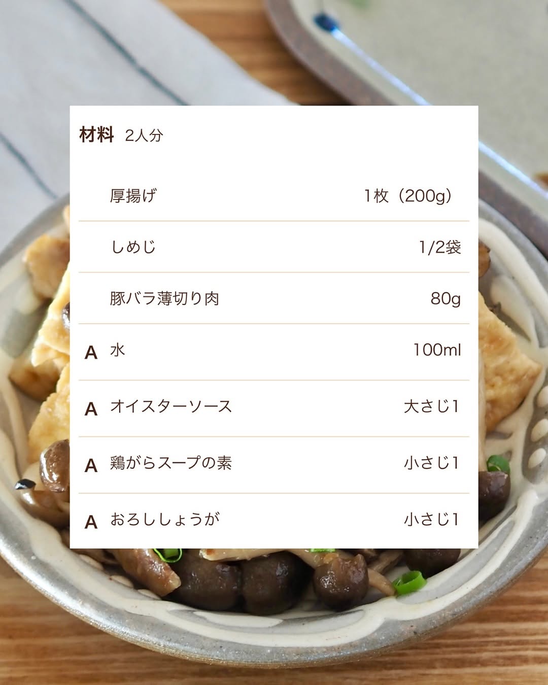 節約にぴったりな副菜レシピ🍳 厚揚げとしめじの中華風炒め煮✨ ボリュームがあって ご飯によく合います! メイン料理、何かもの足りないな... って時におすすめです。 よかったらお試しください! 【材料】(2人分) 厚揚げ...1パック(200g) しめじ...1/2袋(80〜100g) 豚バラ薄切り肉...80g A水...100ml Aオイスターソース...大さじ1 A鶏がらスープの素...小さじ1 Aおろししょうが...少々 【作り方】 ①厚揚げ...食べやすい大きさに切る。 しめじ...石突きを取り除いてほぐす。 豚バラ薄切り肉...2〜3cm幅に切る。 ②フライパンに豚肉を入れて中火で炒める。 火が通ったら厚揚げとしめじ、Aを加えて混ぜ、落とし蓋をする。 ③時々混ぜ、煮汁がほぼ無くなるまで煮る。 ⋆⋆⋆⋆⋆⋆⋆⋆⋆⋆⋆⋆⋆⋆⋆⋆⋆⋆⋆⋆⋆⋆⋆⋆⋆⋆⋆⋆⋆⋆⋆⋆⋆⋆⋆⋆⋆⋆ このアカウントでは 料理や買ってよかったものなどを 投稿しています ︎ @usagi.no.recipe ⋆⋆⋆⋆⋆⋆⋆⋆⋆⋆⋆⋆⋆⋆⋆⋆⋆⋆⋆⋆⋆⋆⋆⋆⋆⋆⋆⋆⋆⋆⋆⋆⋆⋆⋆⋆⋆⋆