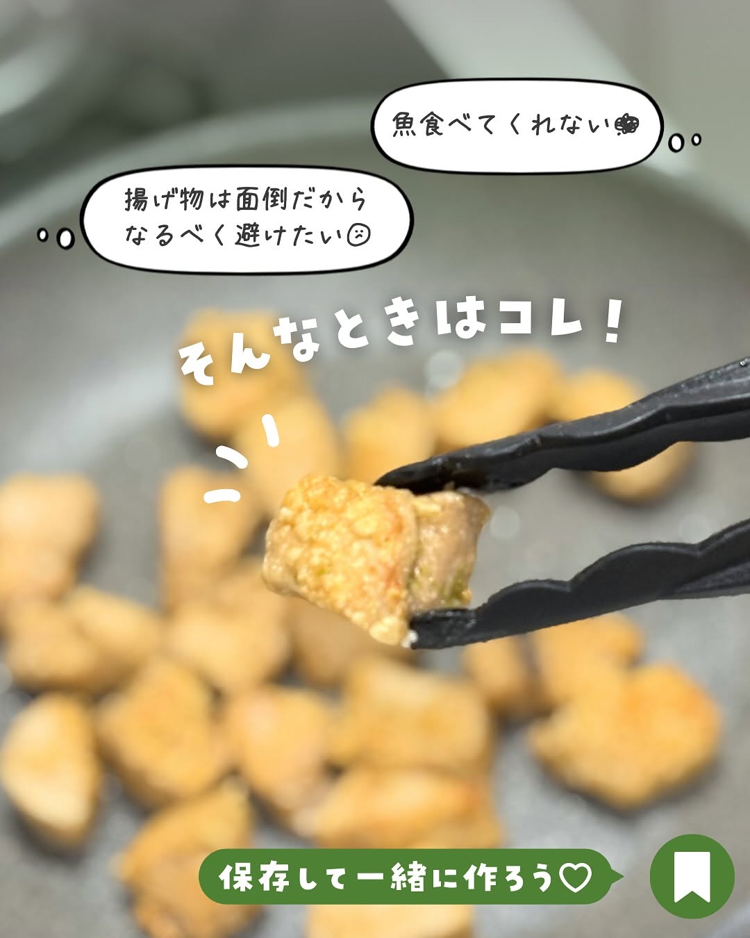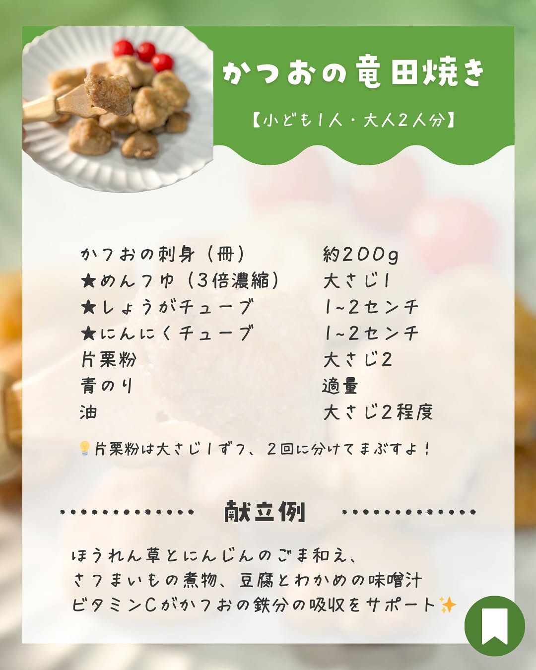 詳しいレシピはこちら👇🏻 @maro_mamagohan ◁ 食べムラっ子も爆食する”神レシピ”発信中💌 フォローして一緒に食べムラ乗り切ろう✊🏻✨ 作ってみたいと思ったら「❤」とコメントしてね♪ 子どもに魚を食べさせたいけど、 うちの娘はなかなか魚を食べてくれない😇 そんな娘が久しぶりに食べてくれたのが、 揚げずにフライパンで作れる かつおの竜田焼き🐟✨ 外はカリッ、中はしっとりで食べやすく、 下味もしっかりついてるから2歳児もパクパク🤭💓 鉄分たっぷりのかつおだから、栄養面もバッチリ🙆🏻♀️ ちなみにビタミンCが豊富な野菜を副菜にすると、鉄分の吸収を助けてくれるよ🥬🍠 保存して作ってみてね🤗 ________________ \ 揚げないかつおの竜田揚げ / 👶🏻 1歳半頃〜 📝 材料(子ども2人+大人1人分) ☑︎ かつお(刺身用さく)…約200g ★ めんつゆ(3倍濃縮使用)…大さじ1 ★ しょうが、にんにくチューブ…1〜2センチ ☑︎ 片栗粉…大さじ2 ☑︎ 青のり…適量 ☑︎ 油…大さじ2 💡市販のしょうが・にんにくチューブは案外添加物がたっぷりって知ってた?🥹 子どもにあげるなら添加物が少なめで香りが抜群にいい、楽天のしょうが・にんにくチューブがおすすめ♡ 気になる人はプロフィール下部の楽天ROOMで「チューブ」って検索してね♩ ⸻ 🍳 作り方 ❶ かつおは一口大に切る。 💡お刺身が入っていたトレーは次の工程で使うから捨てずに取っておいてね♩ ❷ トレーに切ったかつおを戻し、★を揉み込んで10分漬け込む。 ❸ 汁気を軽く拭き取ったら袋に移し、片栗粉大さじ1と青のりをまぶす。 ❹ 全体に均一にまぶせたら片栗粉大さじ1を追加して、揉み込むようにしながらまぶす。 ❺ フライパンに油を熱し、弱目の中火でじっくり焼きカリッと仕上げる。 動かしすぎないのがカリッと仕上げるコツ◎ ⸻ ❄ 保存期間 ❄ 冷蔵:翌日まで 冷凍:1週間以内 ________________ 最後まで読んでくれてありがとう♪ 2歳児を育てるワーママ まろです😊 このアカウントでは ◎ 食べムラっ子がパクパク食べる ◎ 1歳から大人までおいしい 簡単レシピを発信中🍳 ✔︎ もう食べムラにイライラしたくない😢 ✔︎ ごはん時間を楽しく過ごしたい! 👉🏻フォローして、一緒に笑顔で食べムラを乗り切ろう💓 フォロー / いいね / コメント / DM どれもとっても嬉しいです😆 お気軽に絡んでね♪👉🏻@maro_mamagohan #幼児食 #食べムラ #偏食 #親子ごはんの悩みサポート #魚レシピ #かつおレシピ #竜田揚げ