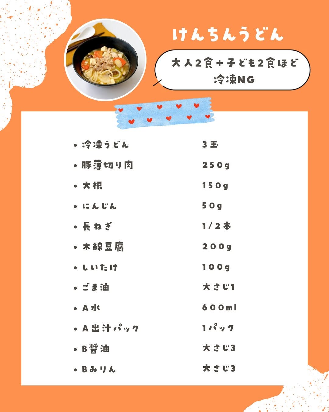 冷えた体にじんわり染みる…🍲💛 寒い季節にぴったりな、具だくさんのけんちんうどんできました❄️ ごま油の香ばしさと、野菜の甘みがほっとする味わい🤤 娘も「おかわりー!」ってたくさん食べてくれた🫶✨ あったかメニューが嬉しい今の時期、 お正月明けのゆるランチにもぴったりです🎍 【具だくさんけんちんうどん】の作り方🌼 🥣 材料(大人2食+子ども2食) ☑︎ 冷凍うどん…3玉(約450g) ☑︎ 豚薄切り肉…200g ☑︎ 大根…150g ☑︎ にんじん…50g ☑︎ 長ねぎ…1/2本 ☑︎ 木綿豆腐…200g ☑︎ しいたけ…100g ☑︎ ごま油…大さじ1 ☑︎ A水…600ml ☑︎ A顆粒だし…小さじ2 ☑︎ B醤油…大さじ1 ☑︎ Bみりん…大さじ1 🥣 作り方 ❶ 豚肉は2センチの長さに切る。 大根・にんじんは皮をむいていちょう切り、長ねぎは輪切り、豆腐は1センチ角、しいたけは薄切りにする ❷ 鍋にごま油を熱し、豚肉・大根・にんじんを中火で炒める ❸ 肉の色が変わったら、Aを加えてアクを取りながら蓋をして10分煮る ❹ B、豆腐、長ねぎ、しいたけ、冷凍うどんを加えてさらに5分煮る ❺ 全体に火が通ったら完成 作ってみたいと思ったら、 コメント欄に❤️で教えてね😋👆🏻 ┈┈┈┈┈┈┈┈┈┈┈┈┈┈┈┈┈┈┈┈ ゆい┊作り置きで楽する離乳食 幼児食 ▷ @yui.kids_gohan \チンするだけ!3分で準備できる離乳食•幼児食🌷/ ◡̈ ¦平日楽できる作り置きレシピ多数🥣 ◡̈ ¦毎日ごはんや🉐情報はストーリー限定👀ˎˊ˗ ◡̈ ¦時間と心にゆとりができ親子でハッピー🤍 👧🏻3y┊食べムラ娘のため試行錯誤中🍳 「1週間マネするだけ!取り分け幼児食献立BOOK」 を作成しました🙌🏻✨ →プロフィールのリンク「幼児食献立BOOK」又は ハイライトの「献立BOOK」 から🌼 いいね/コメント/保存/フォロー 離乳食作りの励みになります🤍 ┈┈┈┈┈┈┈┈┈┈┈┈┈┈┈┈┈┈┈┈ #けんちんうどん #うどんレシピ #冬ごはん #あったかレシピ #汁物レシピ #幼児食 #幼児食献立 #幼児食レシピ #幼児食記録 #幼児食メニュー #幼児食アカウント #フリージング幼児食 #幼児食ストック #幼児食ストック作り #幼児食フリージング #幼児食作り方 #幼児食作り #フリージングストック #フリージング #幼児食作り置き #幼児食冷凍ストック #取り分け幼児食 #取り分けレシピ #取り分けごはん #取り分けご飯 #子どもごはん #こどもごはん #親子ごはんの悩みサポート