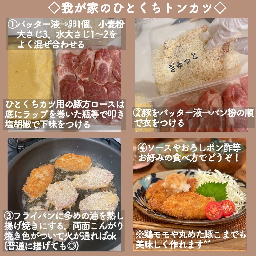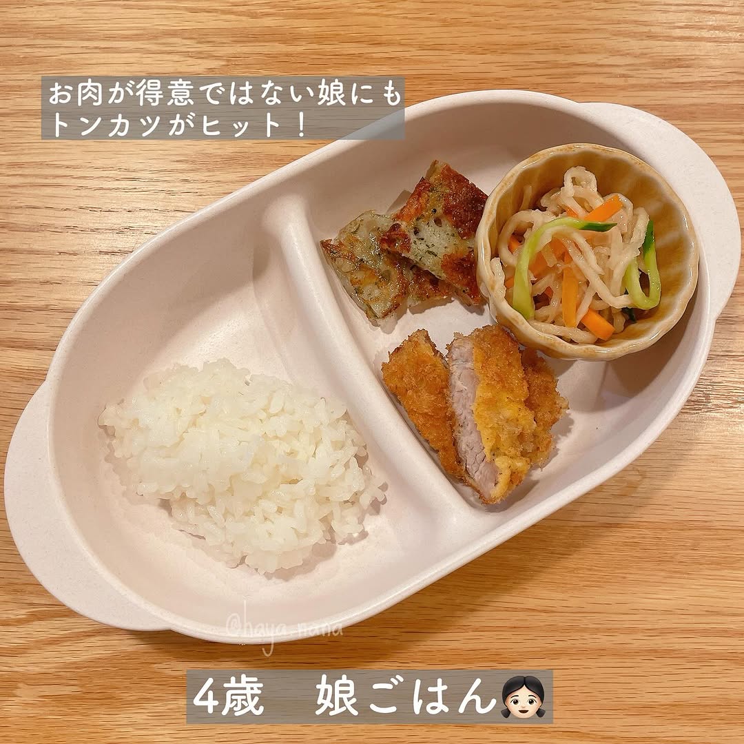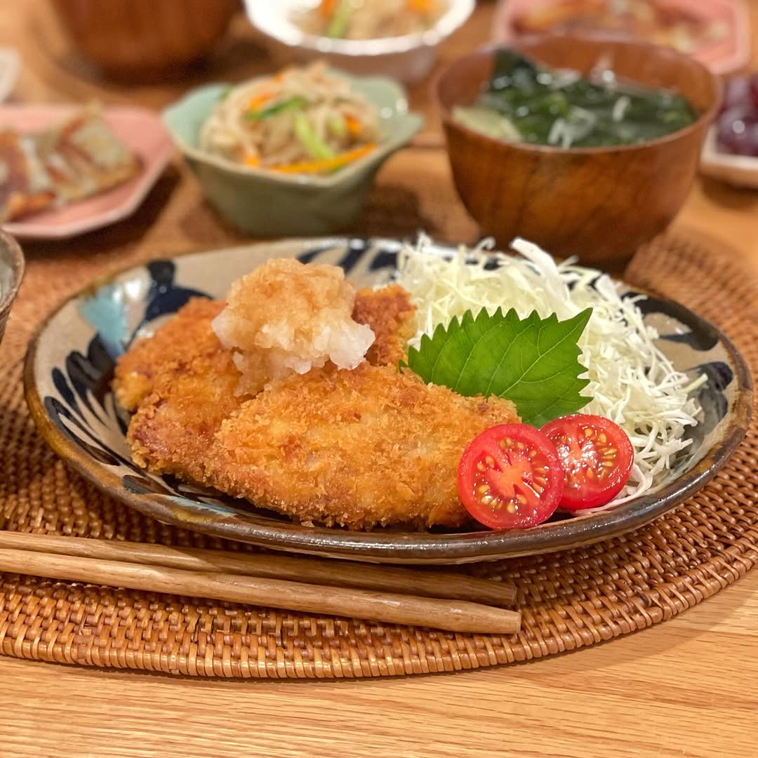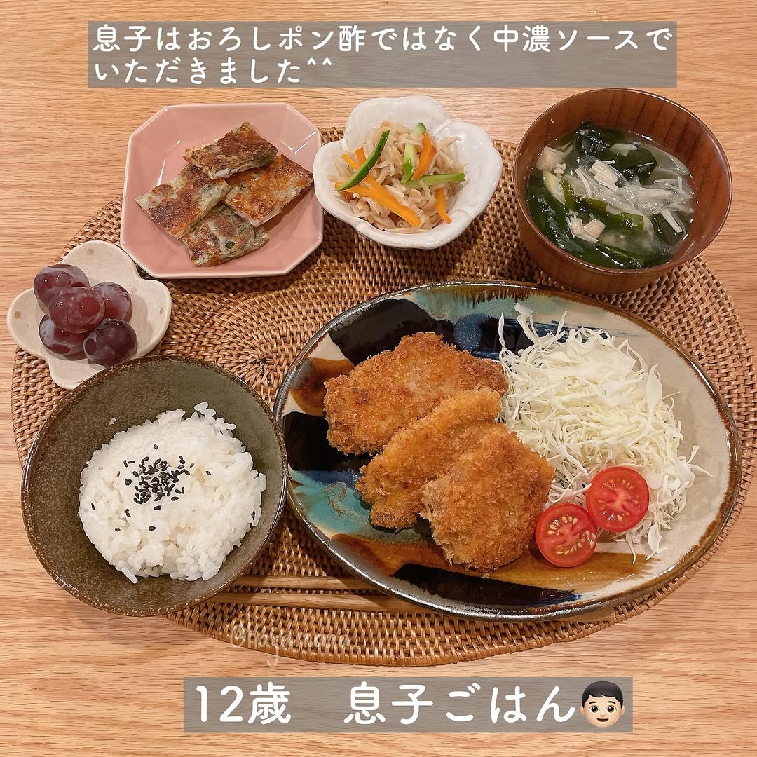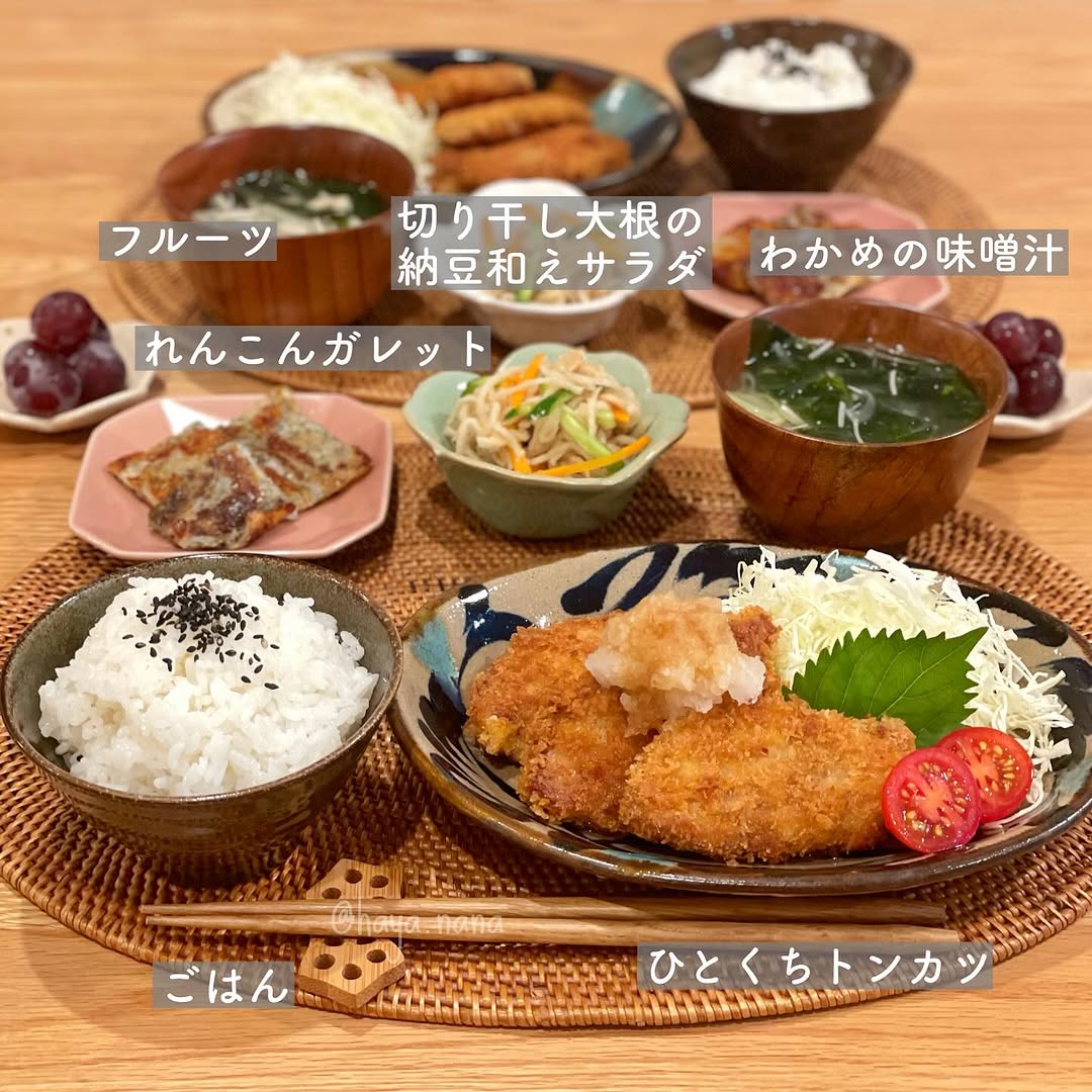 👉#レシピあり ✍️【家族ごはん♡】 *ひとくちトンカツおろしポン酢(レシピあり) *切り干し大根とひきわり納豆の和えサラダ *れんこんガレット *じゃがいもとわかめとえのきの味噌汁 *ごはん *ぶどう こんばんは☺️🙌 ひとくちカツ用の豚肩ロースがお買い得だったので、 叩いて伸ばしてトンカツにしました🐷 瓶の底にラップを巻いて叩くか、ラップ→豚→ラップでサンドして上から叩いています☺️❣️ 塩胡椒振ってバッター液くぐらせてパン粉つけて揚げ焼きするだけなので、レシピというほどでもないですが メモ程度に載せておきます📝 鶏モモ肉や鶏ささみでも美味しく作れます♪ 豚こまをギュッと丸めて、薄めに形を整えても作れます💭 お好みでどうぞ〜🍳 和えサラダは 水で戻した切り干し大根と、細切りのにんじんをふんわりラップして2分くらいレンチン→水で冷やすか粗熱をとってから 千切りきゅうり(塩揉みはしたほうが馴染みやすい)と、ひきわり納豆をまぜまぜ🥣 めんつゆか、ポン酢で味付けするのが好きです! ここに茹でた小松菜や、調味料だとマヨネーズやごま油、すりごま等を加えることもあります🫕 れんこんガレットはスライサーでスライスしたれんこんに 片栗粉、青のり、ピザチーズ、塩胡椒でまぜまぜ🥣 多めの油でなるべく薄く広げて、フライパン返しなどでぎゅっと押さえつけながら両面こんがり焼いてます◎ お好みでお塩を振っていただきます🧂 ******* ▼過去のレシピ付き投稿はこちらのタグで #はやななレシピ ▼娘の離乳食〜幼児食記録はこちら @hayanana_baby ******* 息子の身長が、もうあと数ミリで160cmというところまできました👦🏻すでに4月から6cmも伸びていてびっくり😳 私の身長まであと5.5cm🙌 あっという間に抜かされてしまいそうです☺️ *::::::::*::::::::*::::::::*::::::::*::::::::*::::::::*::::::::* #おうちごはん #簡単ごはん #簡単レシピ #料理記録 #家族ごはん #節約料理 #献立日記 #和食ごはん #夕飯のおかず #親子ごはんの悩みサポート #豚肉料理 #とんかつ #れんこん