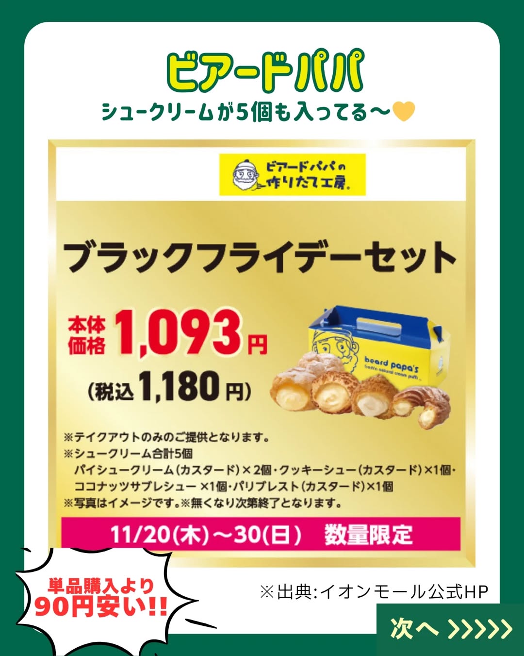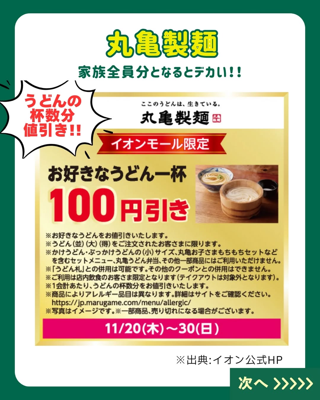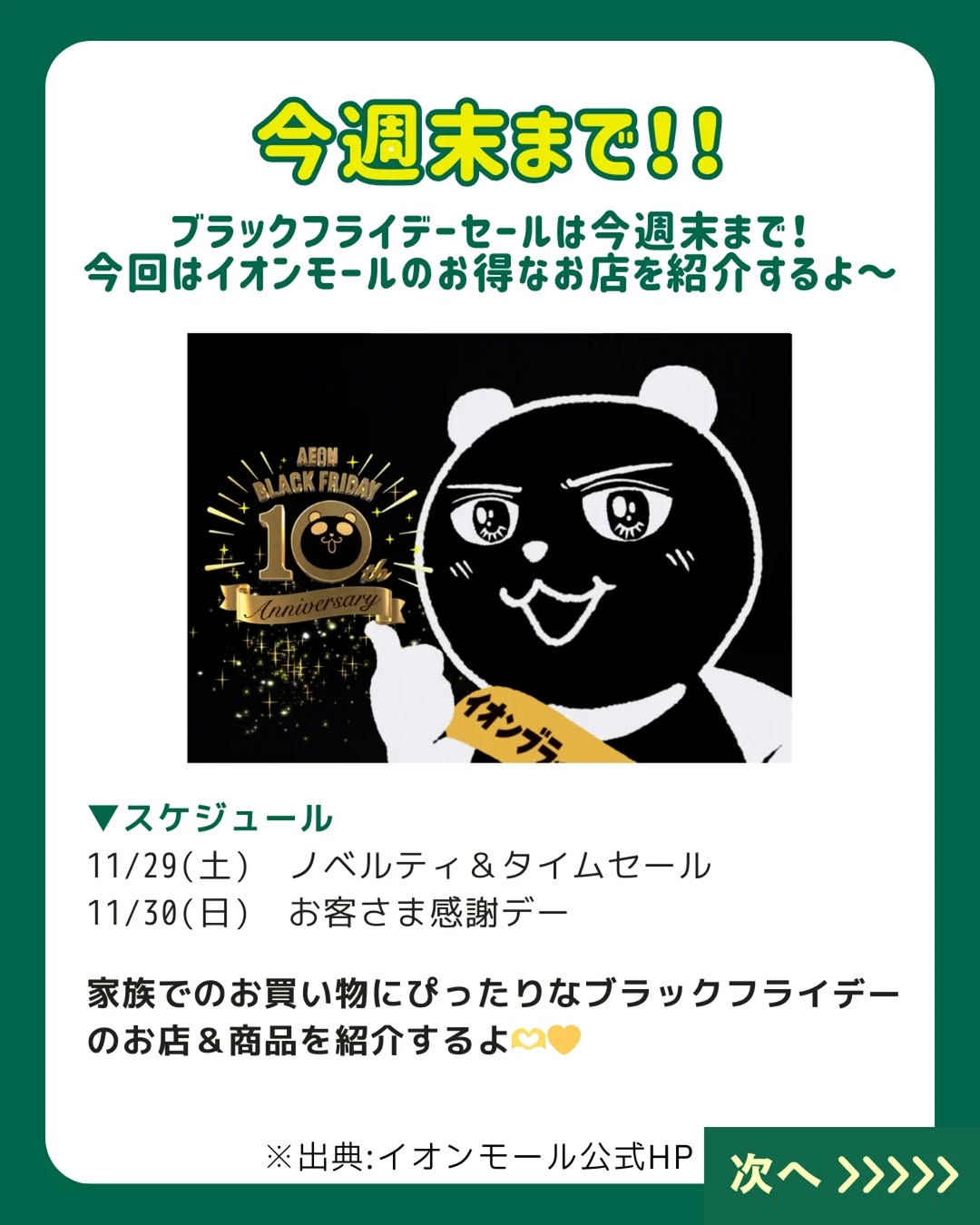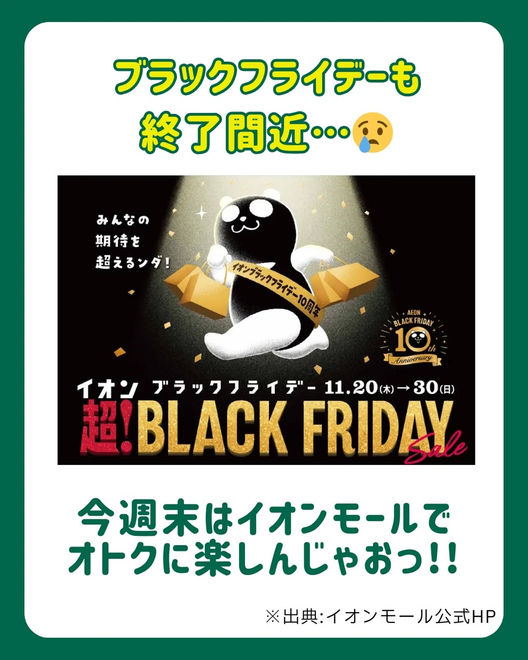こんにちは☀ 「くふう.キッズごはん」スタッフです☺️💕 子どもごはん、仕事、家事… “ママパパって本当に休むヒマがないよね”という毎日に、 少しでもラクとお得を届けたくて、今日も役立つニュースをお届けします🛍️ 🎉 イオンモールのブラックフライデーが開催中! 「外食の値引き」「ノベルティ」「おやつの特価」など、 “子育て家庭に嬉しい”注目ポイントがたくさん出ています👇️✨️ 🍜 丸亀製麺 家族全員分のうどんが“1杯ずつ100円引き”! 小さい子も食べやすいので、外食での救世主💖 🍰 FLO(ケーキ) ホールもカットも30%OFFでおやつや手土産にぴったり🎂 🧸 Can★Do 110円雑貨が“1点無料”になるクーポン🎫 離乳食グッズや収納など、子どもまわりにも便利! 🍩 ビアードパパ シュークリーム5個入りセットがお得に! 家族みんなで分けやすい◎ 🍫 GODIVA ご褒美にもプレゼントにも使える限定バッグ付きセット💛 🎬️ TOHO CINEMAS(追加分) 映画館名物の「パーティーポップ」が310円引き🍿 映画を観ながらのちょっとしたご褒美にも◎ 📱アプリは事前にチェック! イオンモールアプリはクーポンが驚くほど豊富👀✨️ キッズクラブに入会すると、アイスやお買い物券の特典も👧👦 家族でのお出かけ前にぜひ入れておきたいアプリです! 🗓️ ブラックフライデー期間:11/30(日)まで 今年の“お得”は今がピーク! 外食、食材、おやつ… 家族との日常に取り入れやすいものばかりなので、 この週末にぜひチェックしてみてくださいね🤍 ※画像出典:イオンモール公式HP — 🍚「くふう.キッズごはん」では… ▶️ 子どもが食べやすいレシピ ▶️ 子連れ外食情報 ▶️ レトルト・冷食のラク活用 ▶️ ストック食材のおすすめ など、毎日がちょっとラクになる情報を発信中✨️ フォローして、“こどもごはん”気楽にいこ~💗 #ブラックフライデー #ブラックフライデーセール #イオン #イオンモール