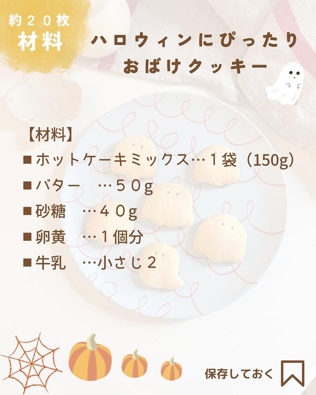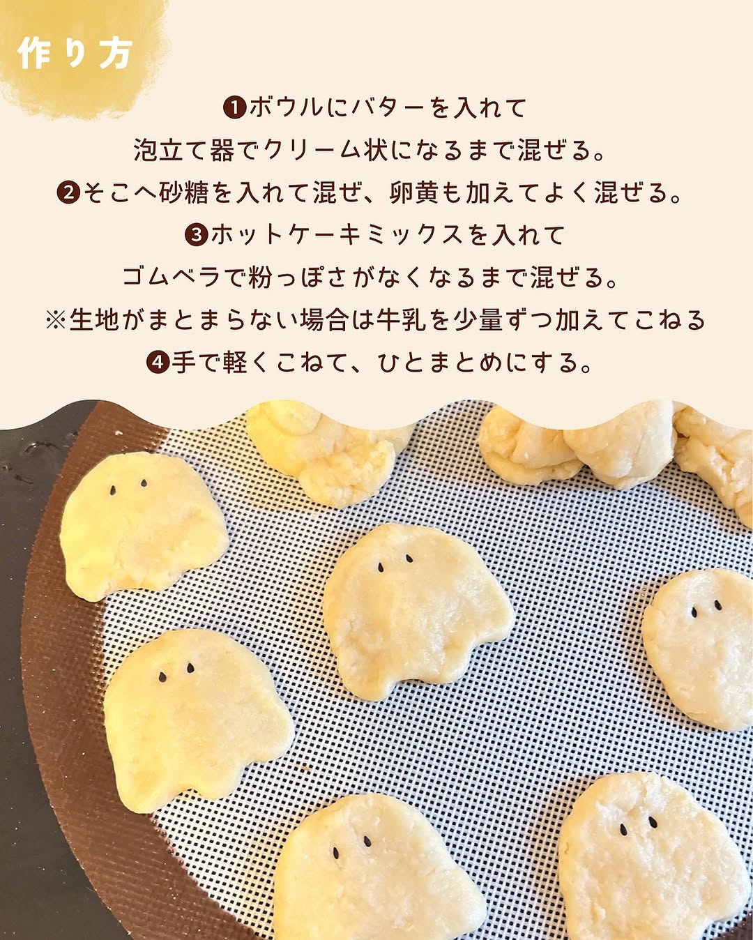 〖 型抜き不要🥞ホットケーキMIXでゆるゆるおばけサブレ 〗@oto___rii ⇦その他の簡単かわいいイベントごはんはこちら🌷 お家におばけの型がなくても作れる お手軽なハロウィンお菓子の紹介です🍪 粘土のようにコネコネして 好きな形のおばけを作ってみてね〜👻 ﹏﹏﹏﹏﹏﹏﹏﹏﹏﹏﹏﹏﹏﹏﹏﹏ 【材料】おばけクッキー ◼︎ホットケーキミックス…1袋(150g) ◼︎バター …50g ◼︎砂糖 …40g ◼︎卵黄 …1個分 ◼︎牛乳 …小さじ2 【作り方】 ❶ボウルにバターを入れて、泡立て器でクリーム状になるまで混ぜる ❷そこへ砂糖を入れて混ぜて、卵黄も加えてよく混ぜる ❸ホットケーキミックスを入れて、ゴムベラで粉っぽさがなくなるまで混ぜる。 (生地がまとまらない場合は牛乳を少量ずつ加えてこねる) ❹手で軽くこねて、ひとまとめにする。 ❺おばけの形を作り、(焼く前は)黒胡麻や (焼き上がったら)チョコペンなどで目をつける ❻ 180℃のオーブンで10~13分、こんがり焼き色がつくまで焼く。 焼き上がったらすぐ網の上にとって冷ます。 ハロウィンレシピたくさん投稿していくので フォローして待っててね🎃 作り方でわからないことなどあれば お気軽にコメントやDMくださいね📝 ﹏﹏﹏﹏﹏﹏﹏﹏﹏﹏﹏﹏﹏﹏﹏﹏ とり|簡単かわいいイベントごはん @oto___rii ☜忙しいママ&料理が苦手でも ちょっとだけ特別な日に作りたいレシピをお届け🌷 フォローしていただけるとうれしいです♡ つくれぽもお待ちしております タグ付けでダッシュで伺います🐣 ﹏﹏﹏﹏﹏﹏﹏﹏﹏﹏﹏﹏﹏﹏﹏﹏ #ホットケーキミックス #ホットケーキミックスレシピ #ホケミ #おばけクッキー #ハロウィンレシピ #ハロウィン #ハロウィンごはん #お菓子作り #お菓子レシピ #ミックス粉 #おうちスイーツ #クッキーレシピ #クッキー作り #こどもと料理 #こどもとつくる #こどものおやつ #簡単レシピ #こどもごはん #幼児食レシピ #フーディーテーブル #フーディストノート