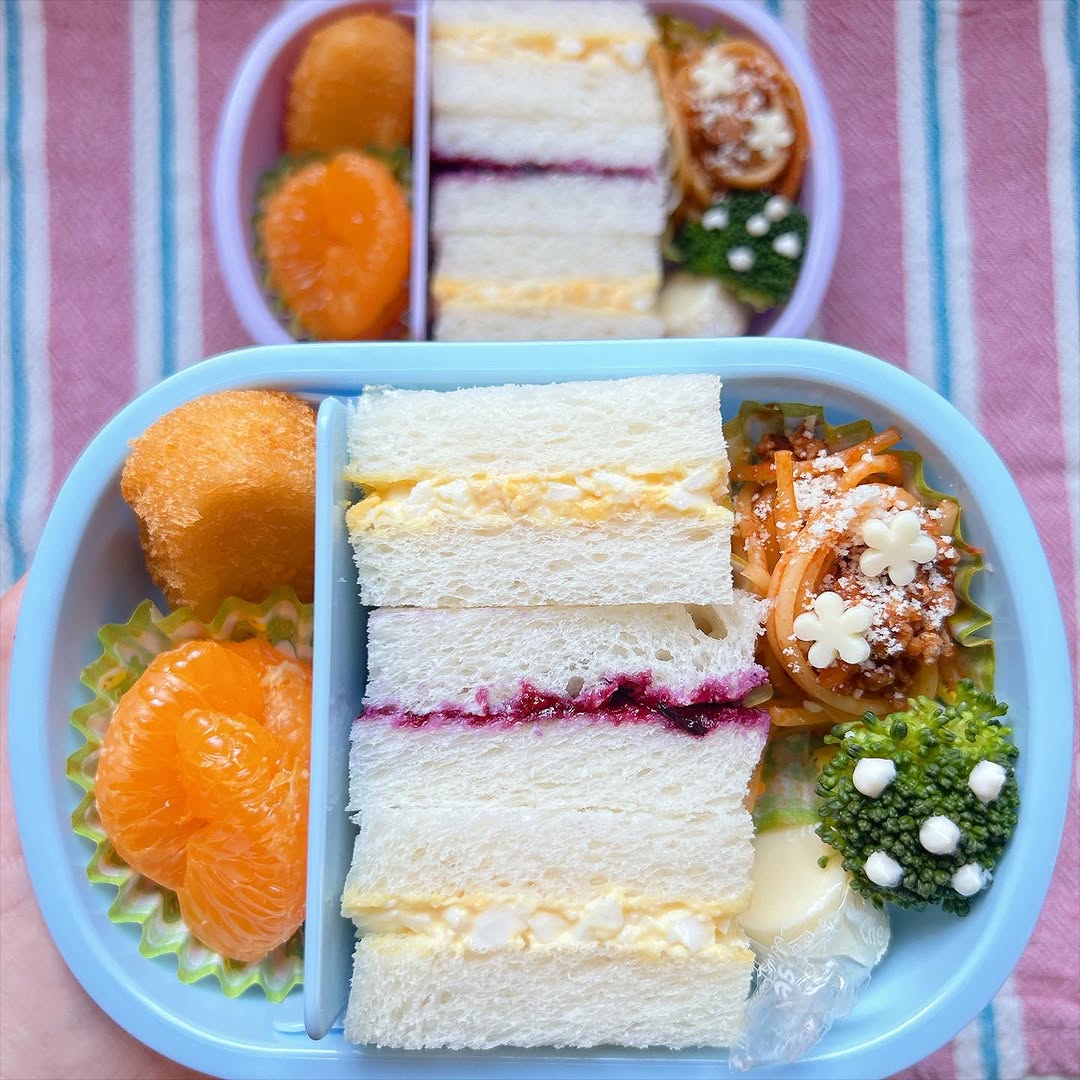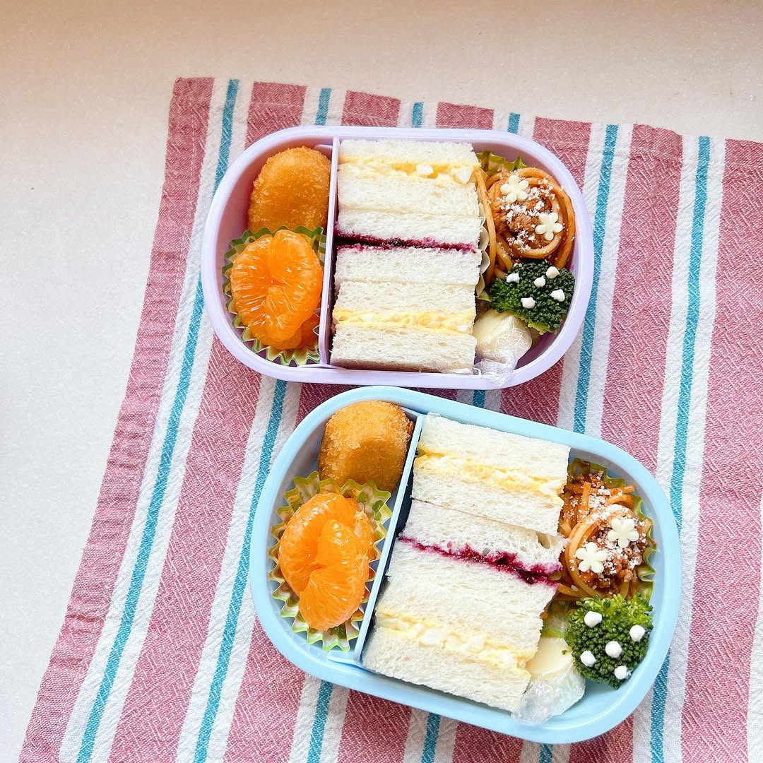 2026.1.15 今日はサンドイッチ🌼 パスタは作り置き冷凍です❄️ サンドイッチ(たまご、🫐) パスタ コーンクリームコロッケ キャンディチーズ 🥦、🍊 ・ ・ #お弁当#サンドイッチ弁当#親子ごはんの悩みサポート #幼稚園弁当#年中弁当
