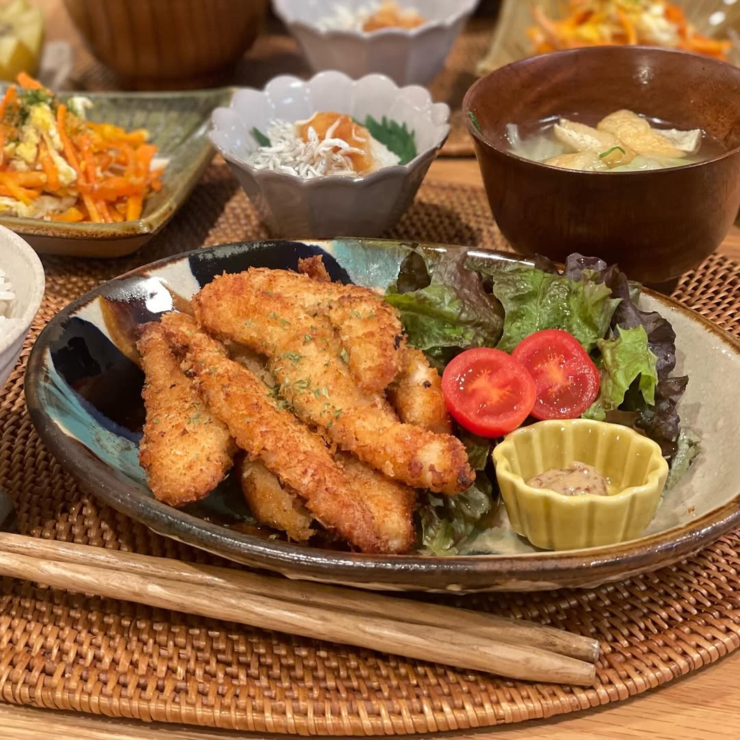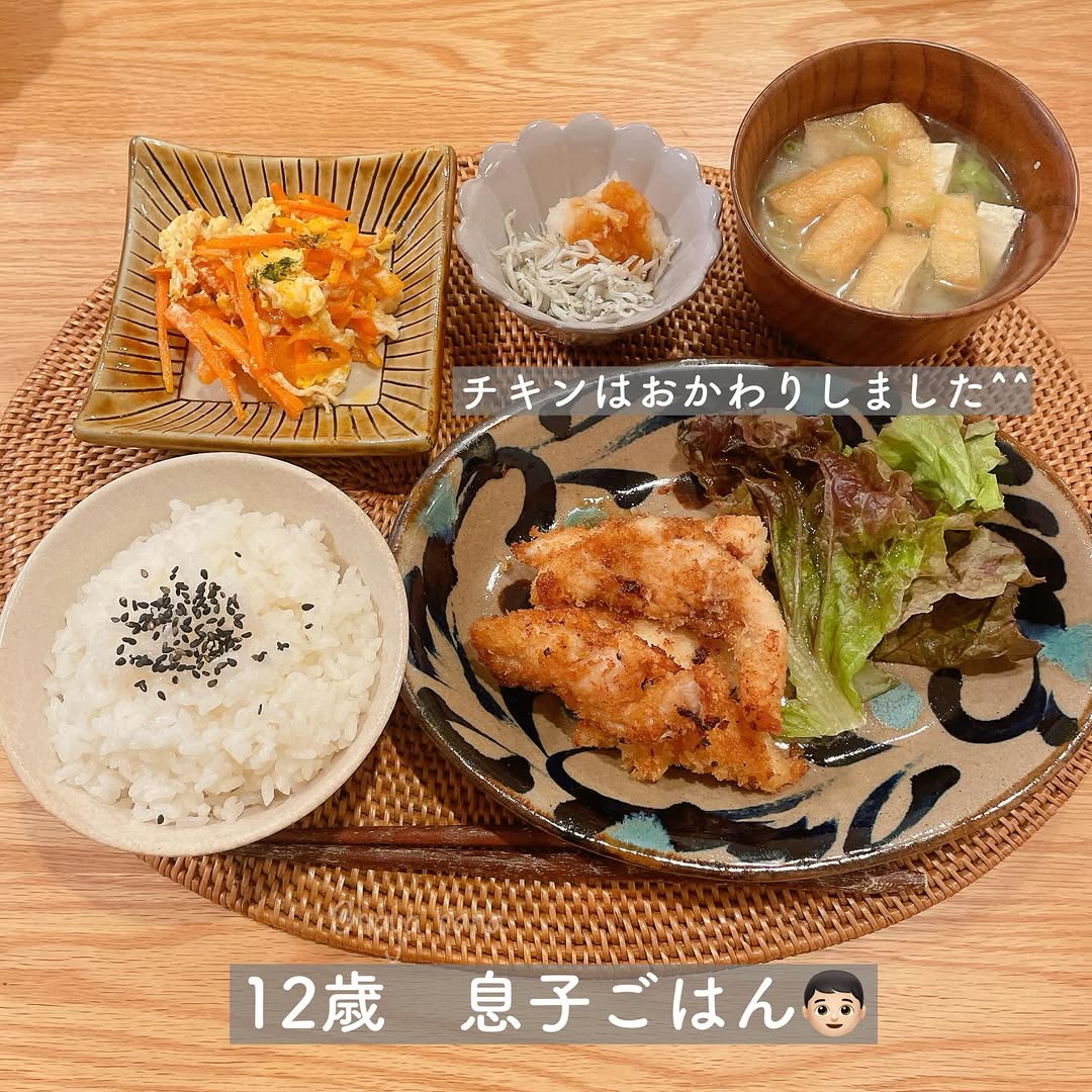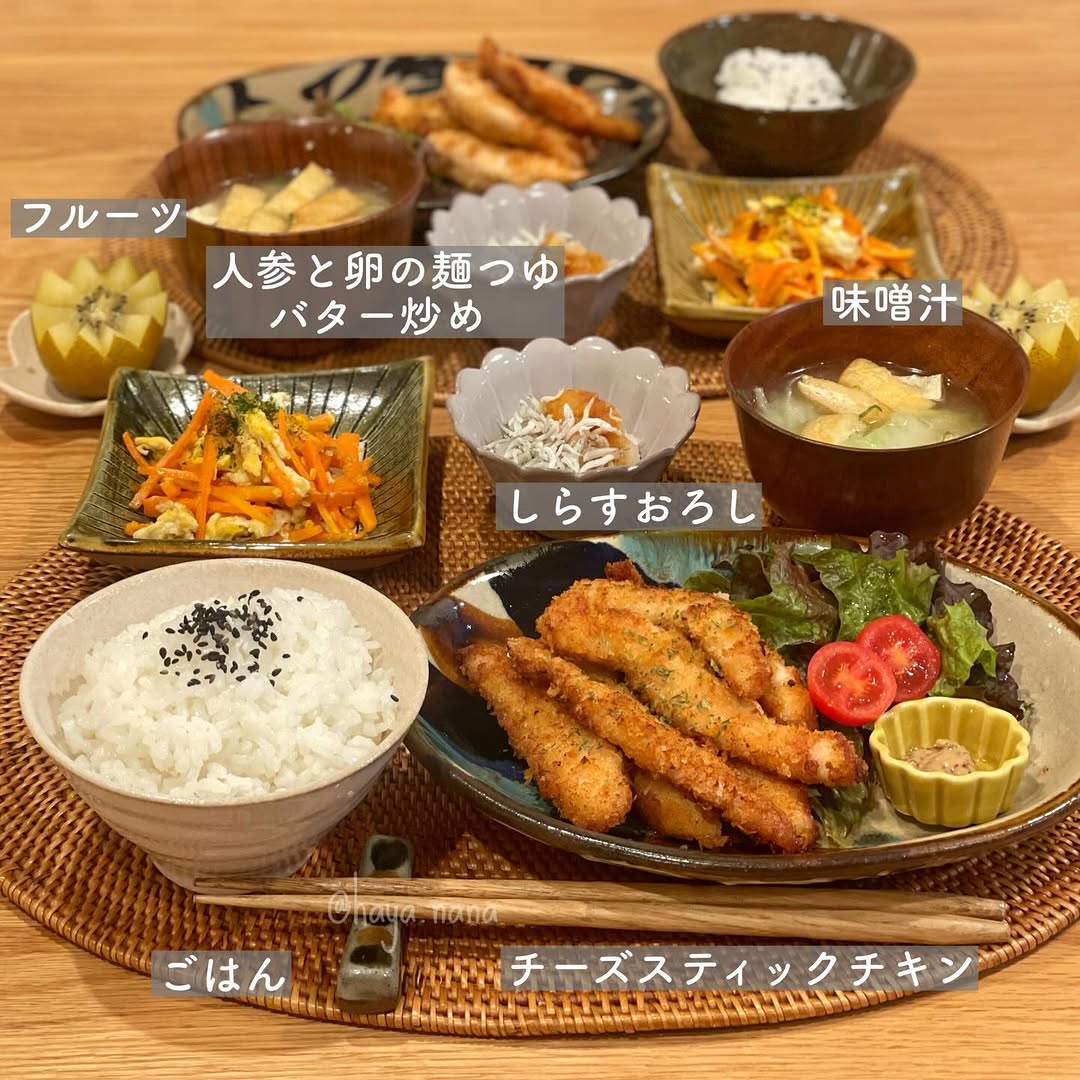 👉#レシピあり ✍️【家族ごはん♡】 *チーズスティックチキン(レシピあり) *しらすおろし *麺つゆバターのにんじん卵炒め(レシピあり) *キャベツと油揚げの味噌汁 *ごはん *キウイ こんばんは☺️ フォロワーさんのリクエストで鶏むねメニューです👌 クリスマスパーティーの一品にもおすすめ🎄 粉チーズを入れてチーズ風味(ほんのりチーズ風味を感じるくらい笑)ですが、入れなくても美味しいです😋 粒マスタードやソース、ケチャマヨやたらマヨ等、ディップソースをいろいろ並べていただくのもパーティー感が出ておすすめです◎ 副菜にはにんじんと卵でできる簡単メニュー バターで炒めて溶き卵を加えて麺つゆで味付けするだけ🍳 青のりを振ってどうぞ! めんつゆの代わりに白だしやポン酢にしてもまた違った美味しさになります👌 お酒のお供にも🍻、お弁当のおかずにも🍱 ******* ▼過去のレシピ付き投稿はこちらのタグで #はやななレシピ ▼娘の離乳食〜幼児食記録はこちら @hayanana_baby ******* クリスマス前ってなんでこんなにワクワクするんですかね☺️🙌 毎日欲しいものが変わる我が家の娘に、サンタさんも振り回されていることでしょう…🎅笑 私はカバンとスニーカーがほしいです…!!!!(大声) *::::::::*::::::::*::::::::*::::::::*::::::::*::::::::*::::::::* #おうちごはん #簡単ごはん #簡単レシピ #料理記録 #家族ごはん #節約料理 #献立日記 #和食ごはん #夕飯のおかず #親子ごはんの悩みサポート #鶏むね肉レシピ #人参レシピ