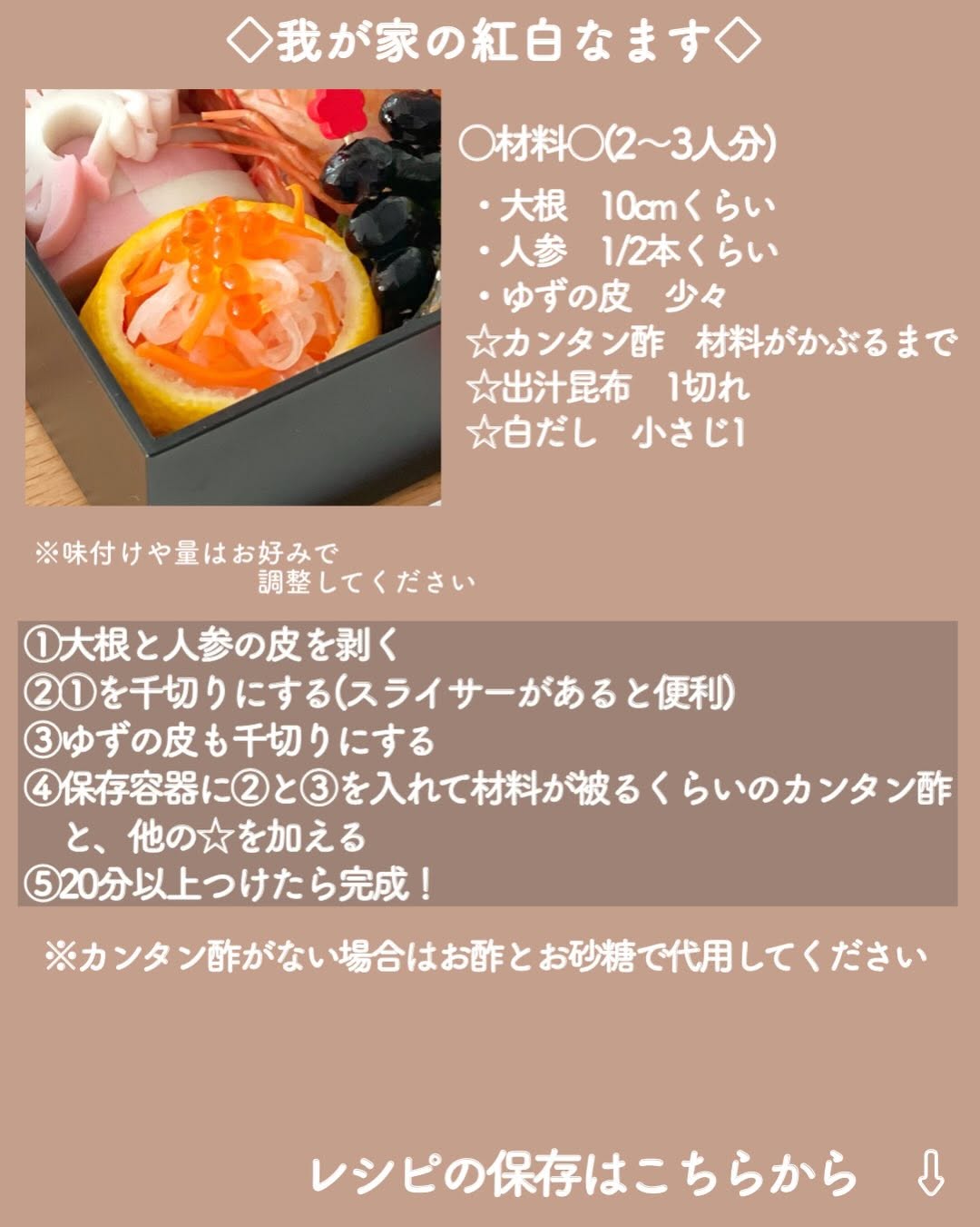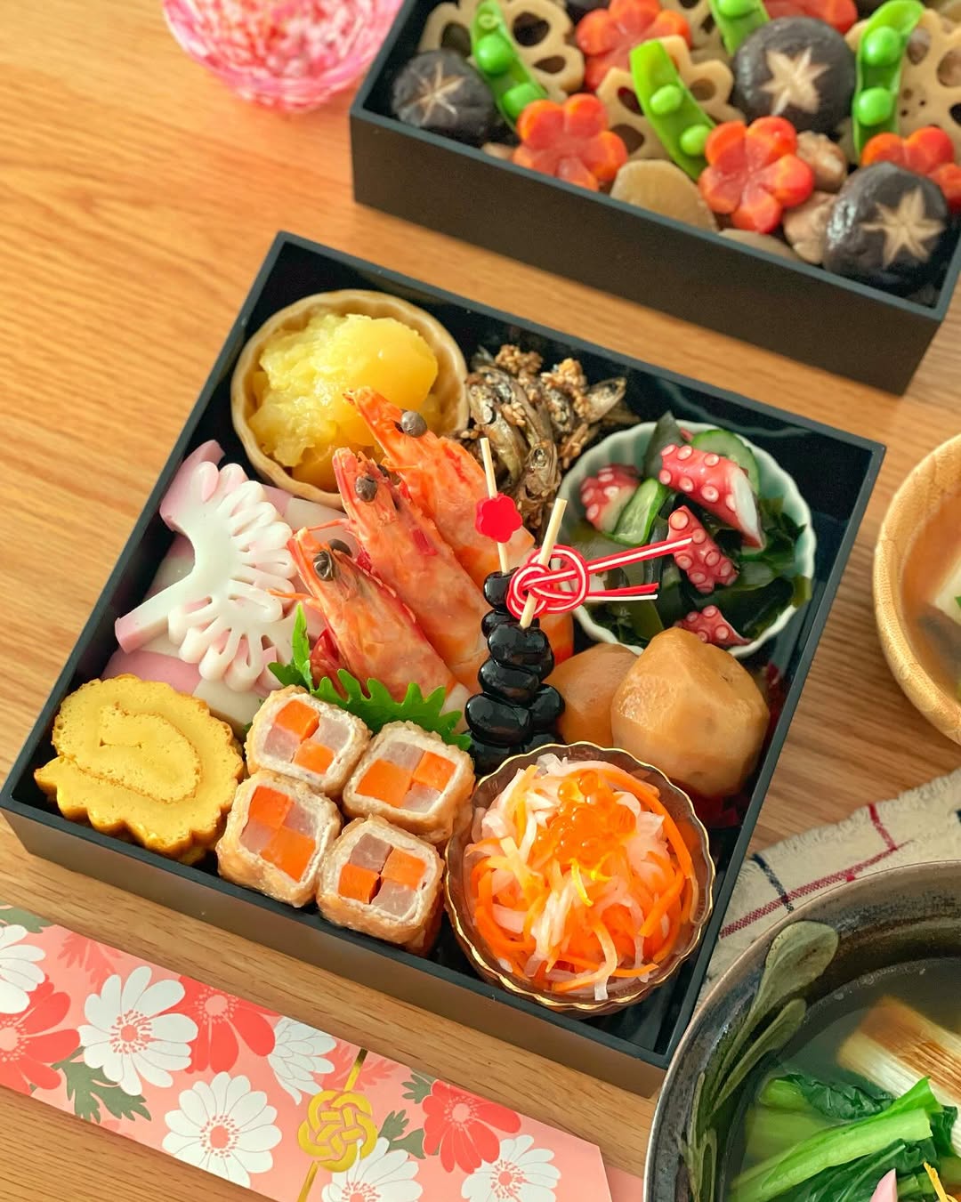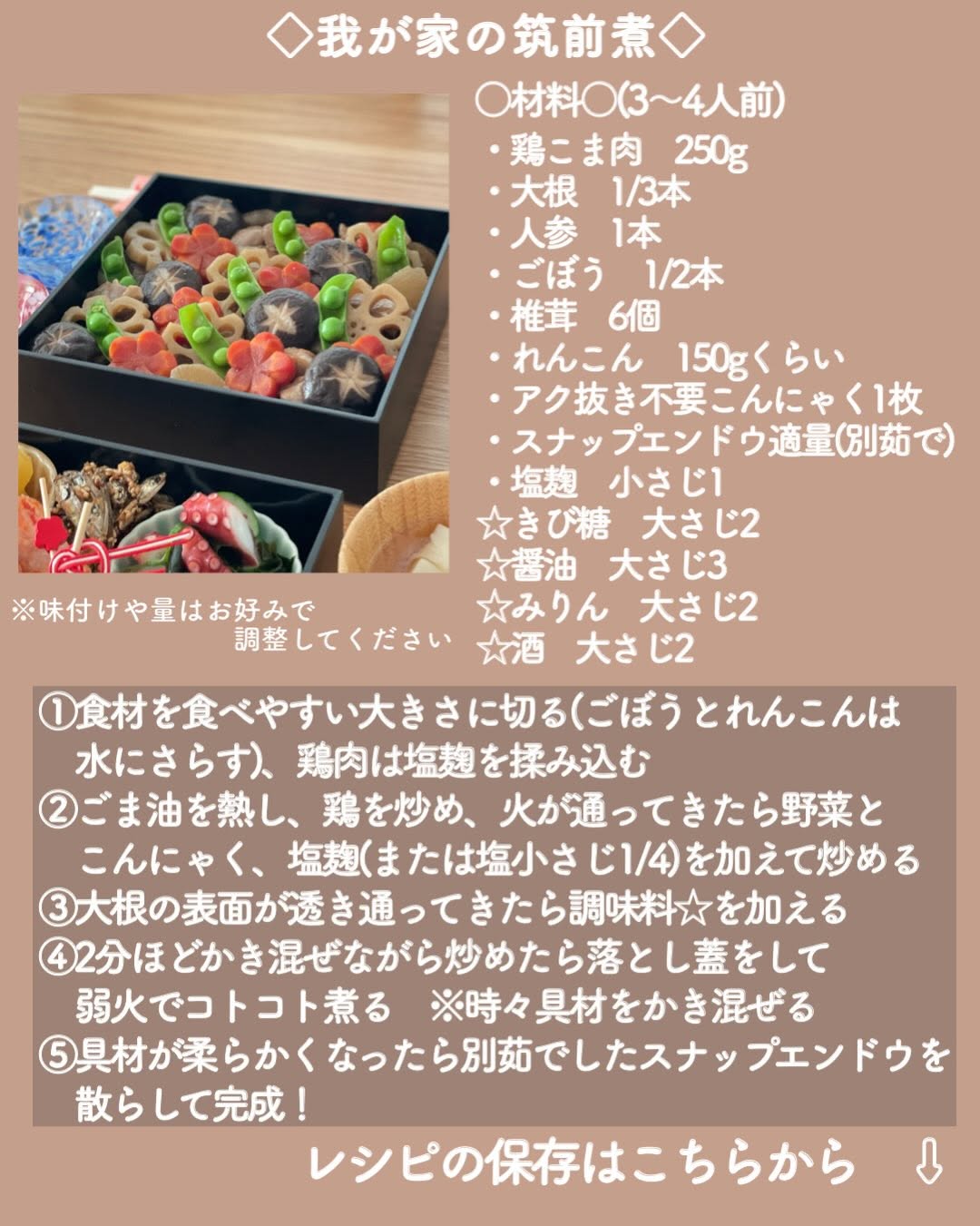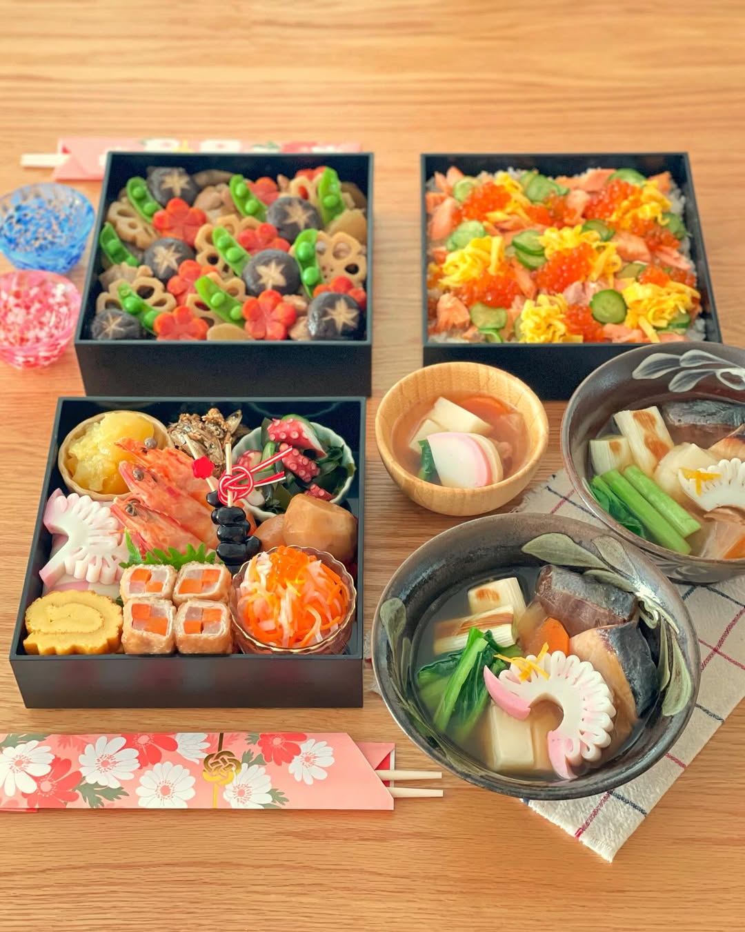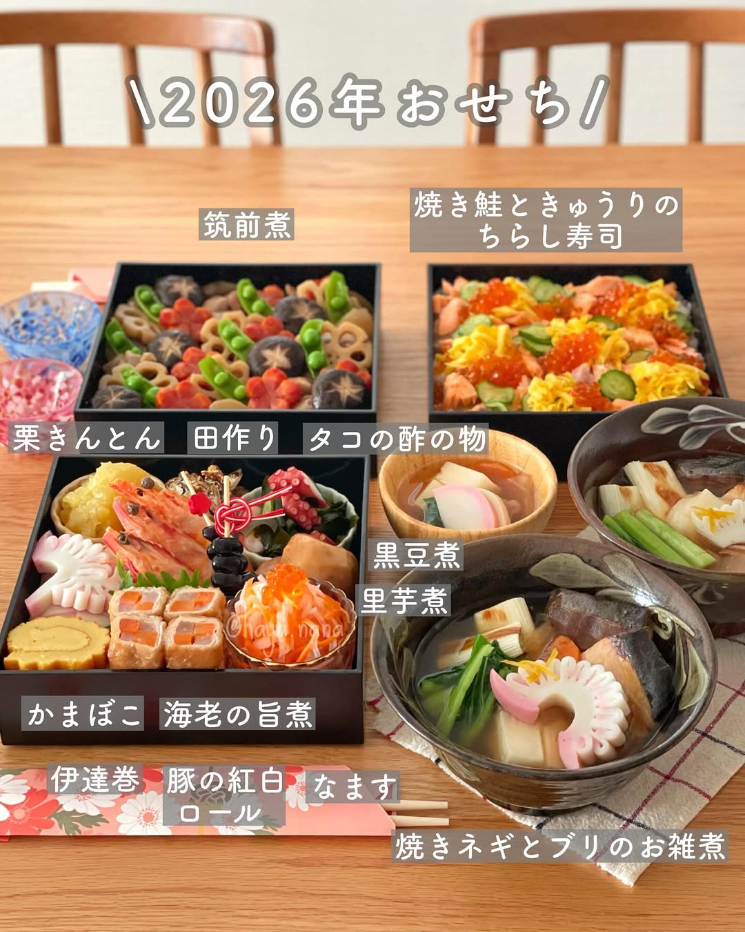 👉レシピあり ✍️【2026年おせち】 あけましておめでとうございます🎍 新年最初の投稿は、毎年恒例の我が家のおせちです🍱 *焼きネギとブリのお雑煮 *焼き鮭ときゅうりのちらし寿司(レシピあり) *筑前煮(レシピあり) *伊達巻(レシピあり) *紅白なます(レシピあり) *里芋煮(レシピあり) *タコの酢の物 *栗きんとん *黒豆煮 *海老の旨煮 *かまぼこ *田作り *豚の紅白ロール 好きなものだけをちょこちょこと。 大晦日に作って、31〜2日くらいで食べ切ります☺️ お雑煮には、年越しそばのお汁に、お餅、 焼いたブリとネギ、茹でた小松菜を入れていただきます🍲 そうそう、今年は @e__miffyy ちゃんの紅白ロールを新たに作ってみました✨おせちが格段に華やかになって嬉しい〜♡ えみちゃんありがとうね☺️ ******* ▼娘の離乳食〜幼児食記録はこちら @hayanana_baby ******* 2026年は息子の中学校入学や、娘のラン活🎒、 夫の仕事もより一層忙しくなりそうです…! 何事も平和にマイペースに、楽しく、気張らず、そして時には全力で!今年一年も駆け抜けていこうと思います🏃♀️♡ 今年もよろしくお願いします✨ *::::::::*::::::::*::::::::*::::::::*::::::::*::::::::*::::::::* #おせち料理 #料理記録 #家族ごはん #献立日記 #親子ごはんの悩みサポート