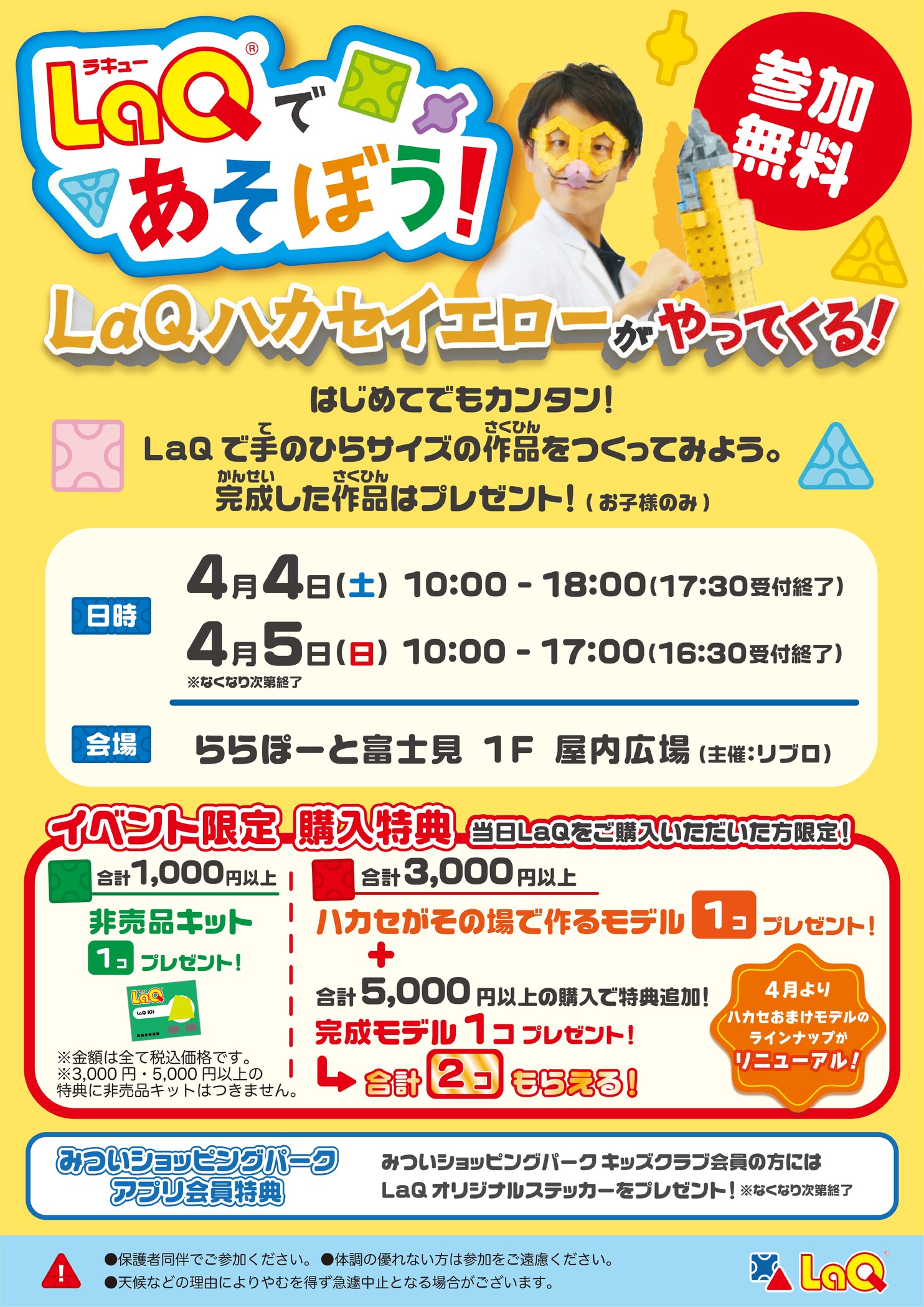 ららぽーと富士見1F屋内広場でLaQハカセイエローと一緒にブロック作り🧩 初めてでも手のひらサイズの作品が作れて、完成品はプレゼント✨ 購入特典もあるよ🎵