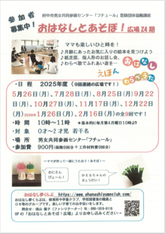 府中市の子育て支援センター「フチュール」で開催!手遊びや読み聞かせで楽しく遊ぼう🎵育児相談もできるから、ママの心のケアにもなりますよ😊駅直結だから雨の日でも濡れずに行けるのが最高☔️
