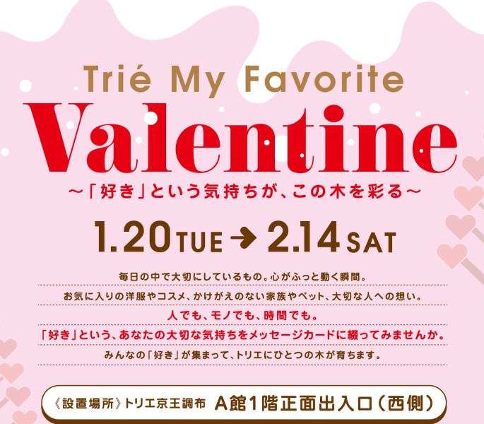 調布駅直結のトリエがバレンタイン仕様に大変身💖フォトジェニックな装飾や展示を楽しもう!お買い物ついでに季節を感じる写真が撮れるスポットです🥰夜はイルミネーションも綺麗かも!?✨
