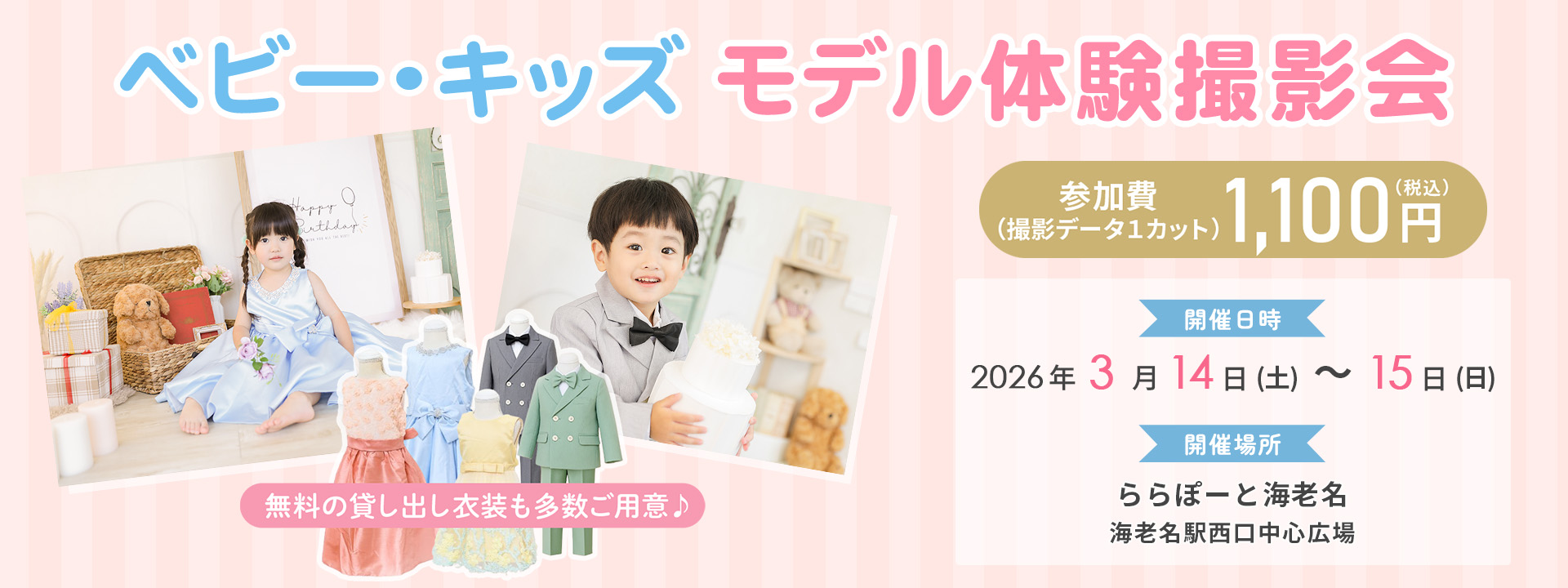 ららぽーと海老名でモデル体験!ドレスやスーツに着替えて、プロカメラマンに撮影してもらおう👗撮影データ1カット付きで1,100円とリーズナブル💕成長の記録や記念日にぴったりです🎂