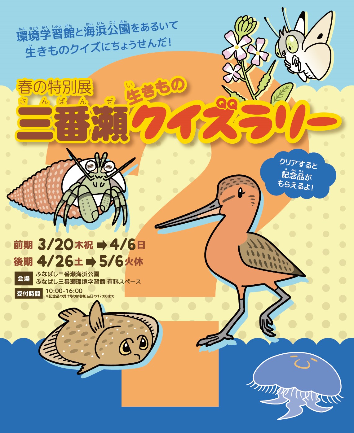 ふなばし三番瀬環境学習館で、館内をめぐるクイズラリーを開催🦀三番瀬にすむ生き物について楽しく学べるイベントです。春休み期間中の開催で、利用料+300円で参加できます📝