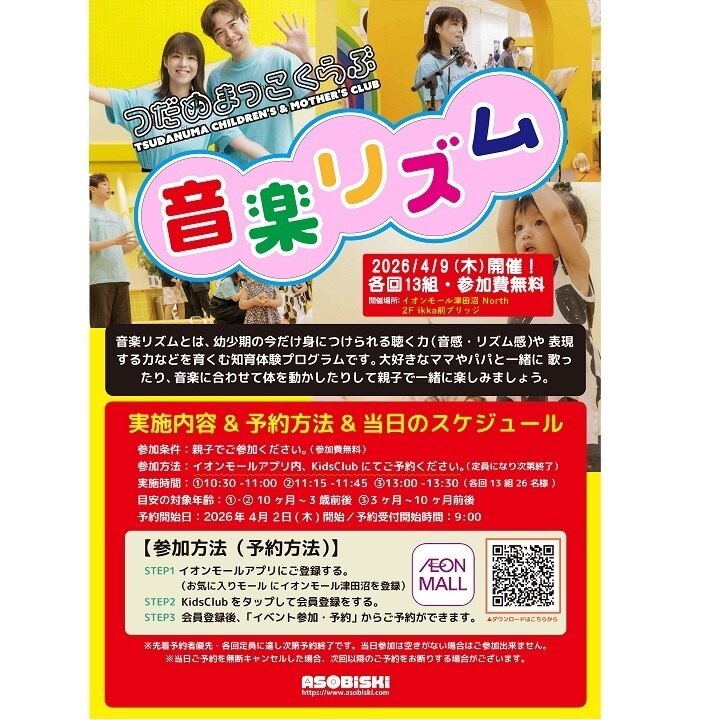 イオンモール津田沼で4月9日開催!🎵✨音楽とリズムで遊ぶ子ども向けクラブだよ😄各回13組限定だから、アットホームな雰囲気が最高💕子どもが音楽を通じて、新しい友だちに出会えちゃう🎶リズム感がぐんぐん育つ素敵な時間です