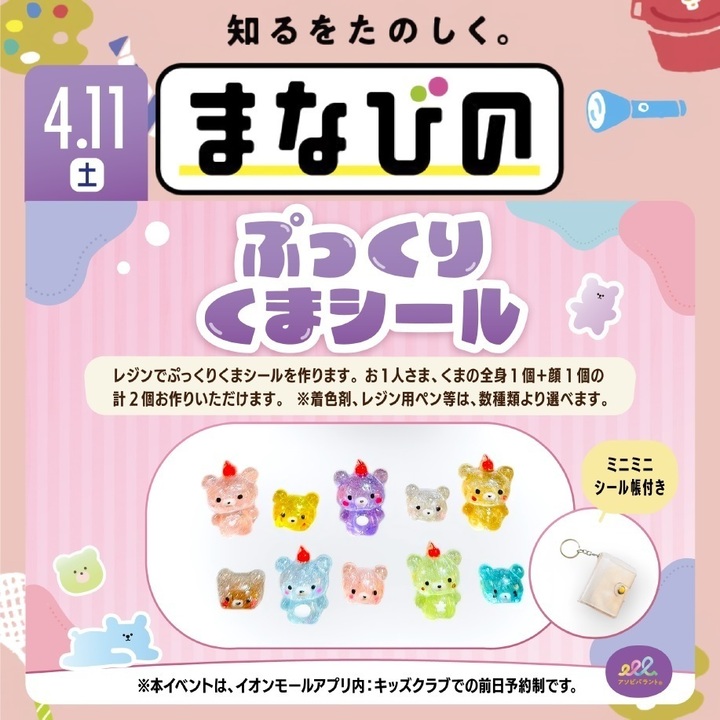 イオンモール船橋で4月11日開催!🐻✨かわいいくまのシールが作れちゃう😄子どもが自分好みにデザインして、オリジナルシールが完成!💕スマホやタブレットに貼ったら、見るたびにニコニコしちゃう🎨親子で夢中になっちゃう工作体験