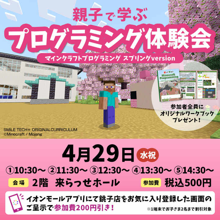 イオンモール銚子2F来らっせホールで開催される親子向けプログラミング教室💻 各回45分で年齢別に複数回開催されるよ✨ はじめてのプログラミングにぴったり🎵