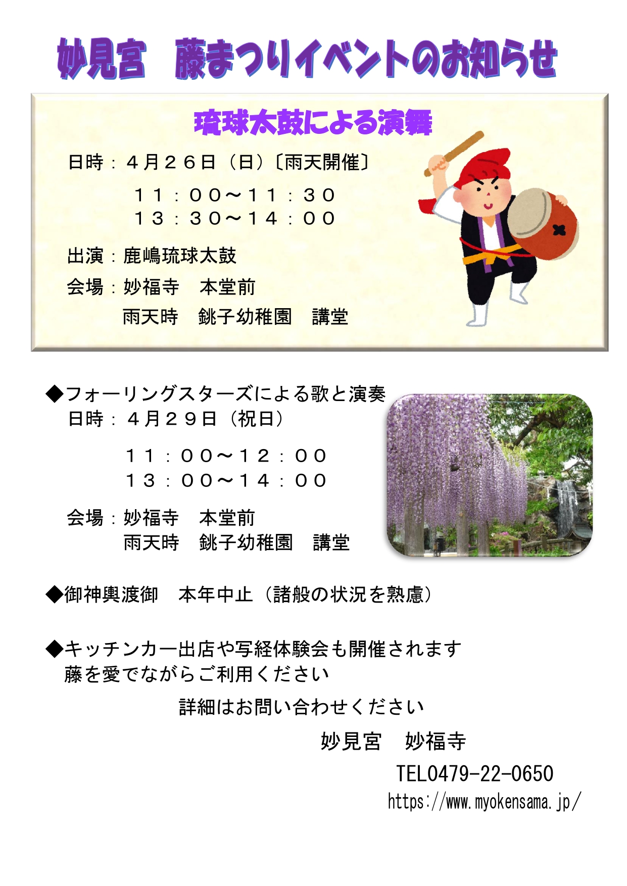 樹齢750年超の見事な藤棚の下で、琉球太鼓の迫力ある演舞やライブ演奏が楽しめるよ🌺🥁 キッチンカーや写経体験もあって一日たっぷり満喫できる!入場無料でお子さんと春のおでかけにぴったり✨