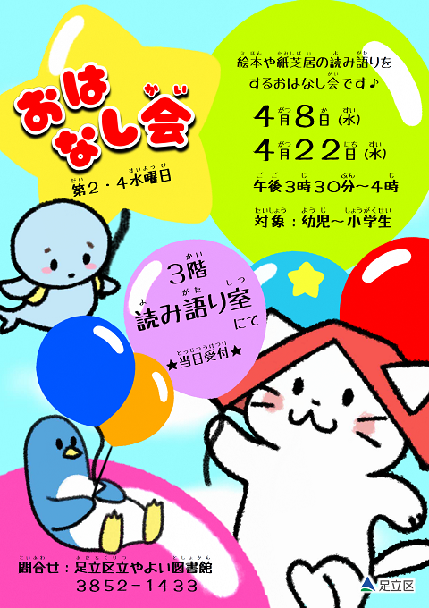 📖 足立区立やよい図書館で定期開催のおはなし会。絵本の読み聞かせや紙芝居を楽しめます。予約不要・参加無料で、お子さまの本好きを育てるきっかけに 🎵✨