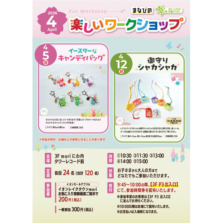 イオンレイクタウンmori 3F moriにわ内で開催される子ども向け体験ワークショップ✨ お買い物ついでに参加できるよ🎵