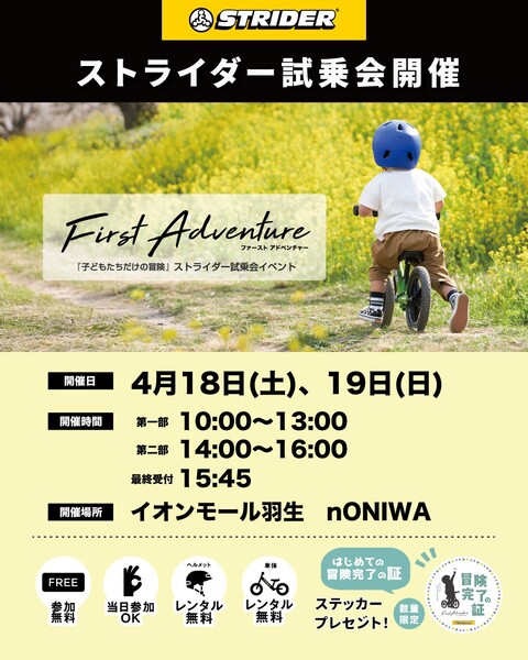 イオンモール羽生のnONIWA広場で4/18〜19にストライダー試乗会🚲 ムラサキスポーツ主催で10:00〜16:00開催✨ バランスバイクデビューにぴったりの体験イベント🎵
