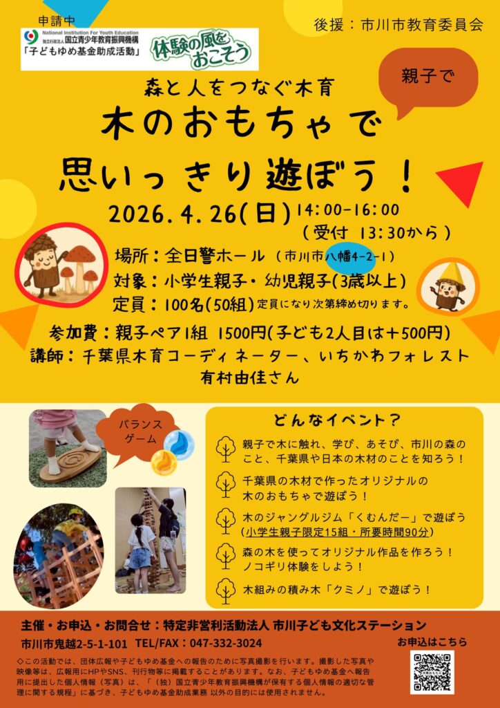 全日警ホールで4月26日開催!🧸✨参加費1500円で、木のおもちゃの世界へようこそ!50組100名限定だから、ゆったりとした雰囲気で遊べちゃう😄自然素材のぬくもりを感じながら、子どもが夢中になっちゃう💕親子で癒される時間になっちゃう