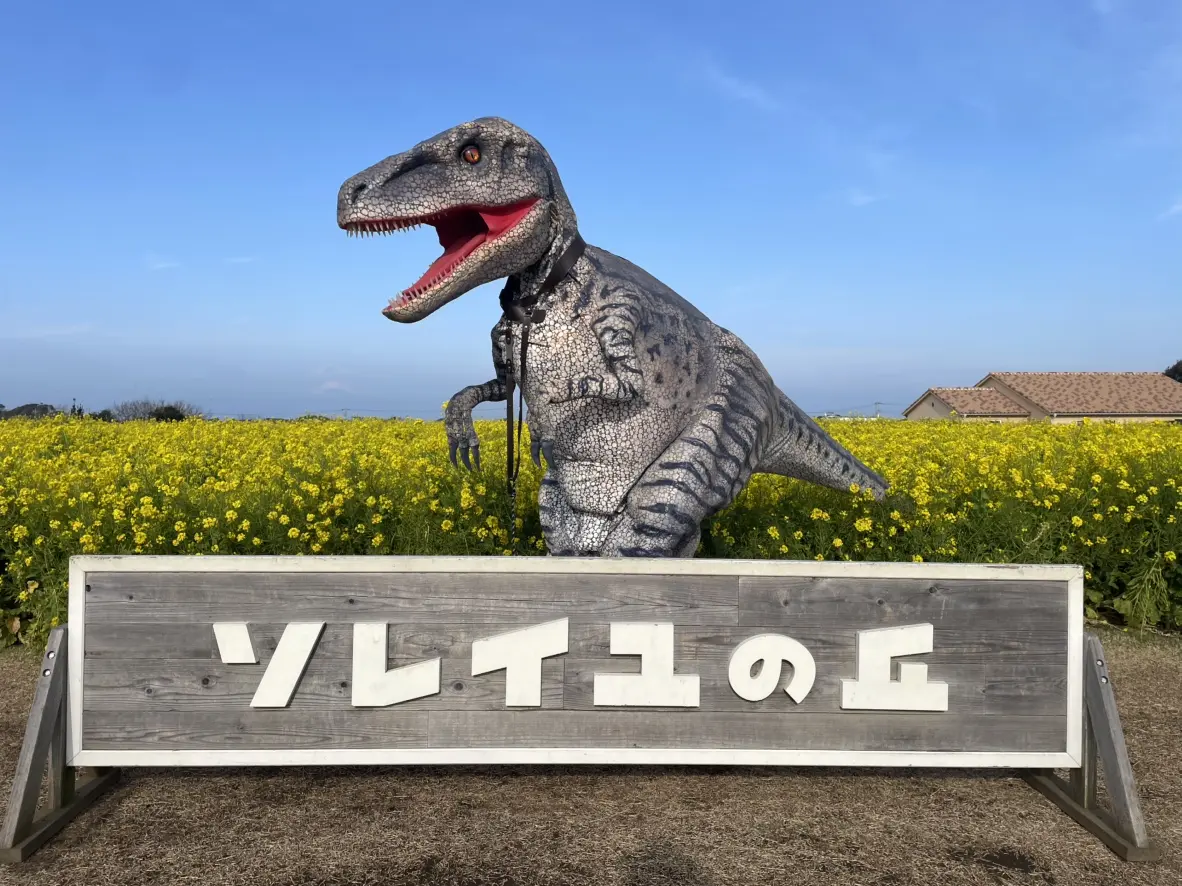 3月の毎週日曜日、ソレイユ恐竜島のオープン記念で恐竜が園内を回遊。全長10m超のティラノサウルスも登場。恐竜との距離が近い、貴重な体験ができます🦕