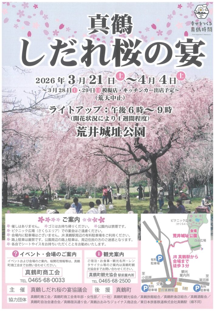 真鶴の荒井城跡公園でしだれ桜が見頃を迎えます🌸夜はライトアップもあり、昼とはまた違った幻想的な雰囲気を楽しめます。