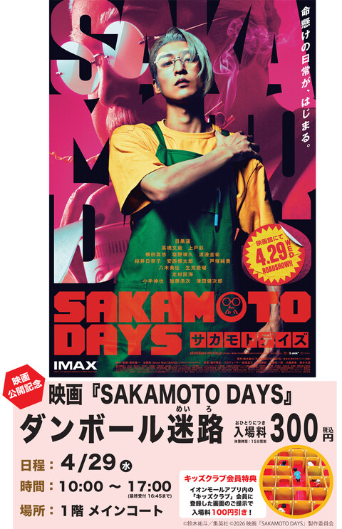 イオンモール日の出にSAKAMOTO DAYSのダンボール迷路が登場🏃✨ 入場料300円でたっぷり遊べるよ!キッズクラブ会員なら100円引きなのも嬉しいポイント🎵 GWのおでかけにぴったり!