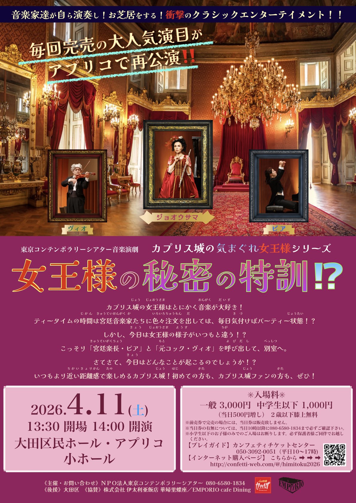 東京コンテンポラリーシアターの音楽演劇「女王様の秘密の特訓!?」が大田区民ホール・アプリコ小ホールで上演🎭 親子で楽しめるユーモアたっぷりの舞台!料金・予約は公式サイトをご確認ください✨